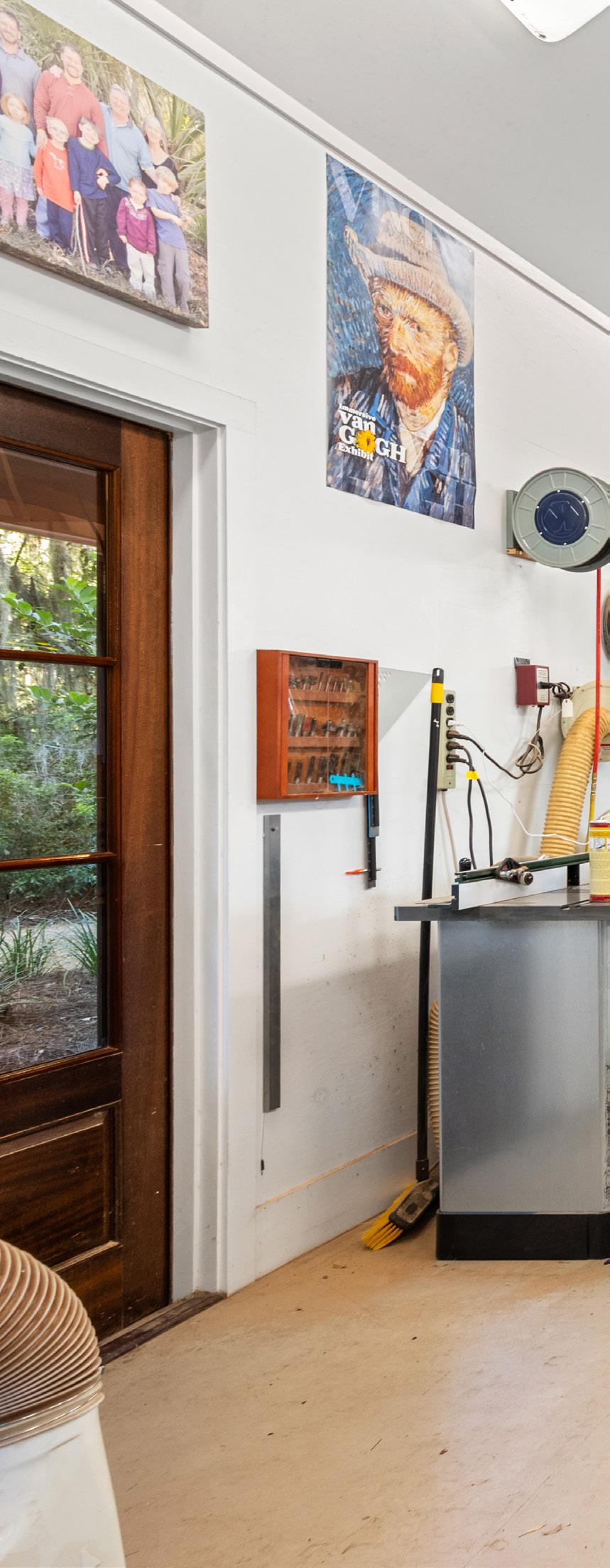 Thoughtful details—including custom tool storage, generous work surfaces, and a loft for additional materials— maximize both functionality and efficiency. Surrounded by lush Lowcountry greenery, the studio blends productivity with serene beauty, offering a truly exceptional setting for woodworking, art, or creative pursuits. Flexible and sophisticated, this space embodies both craftsmanship and luxury, making it a standout feature of the estate.