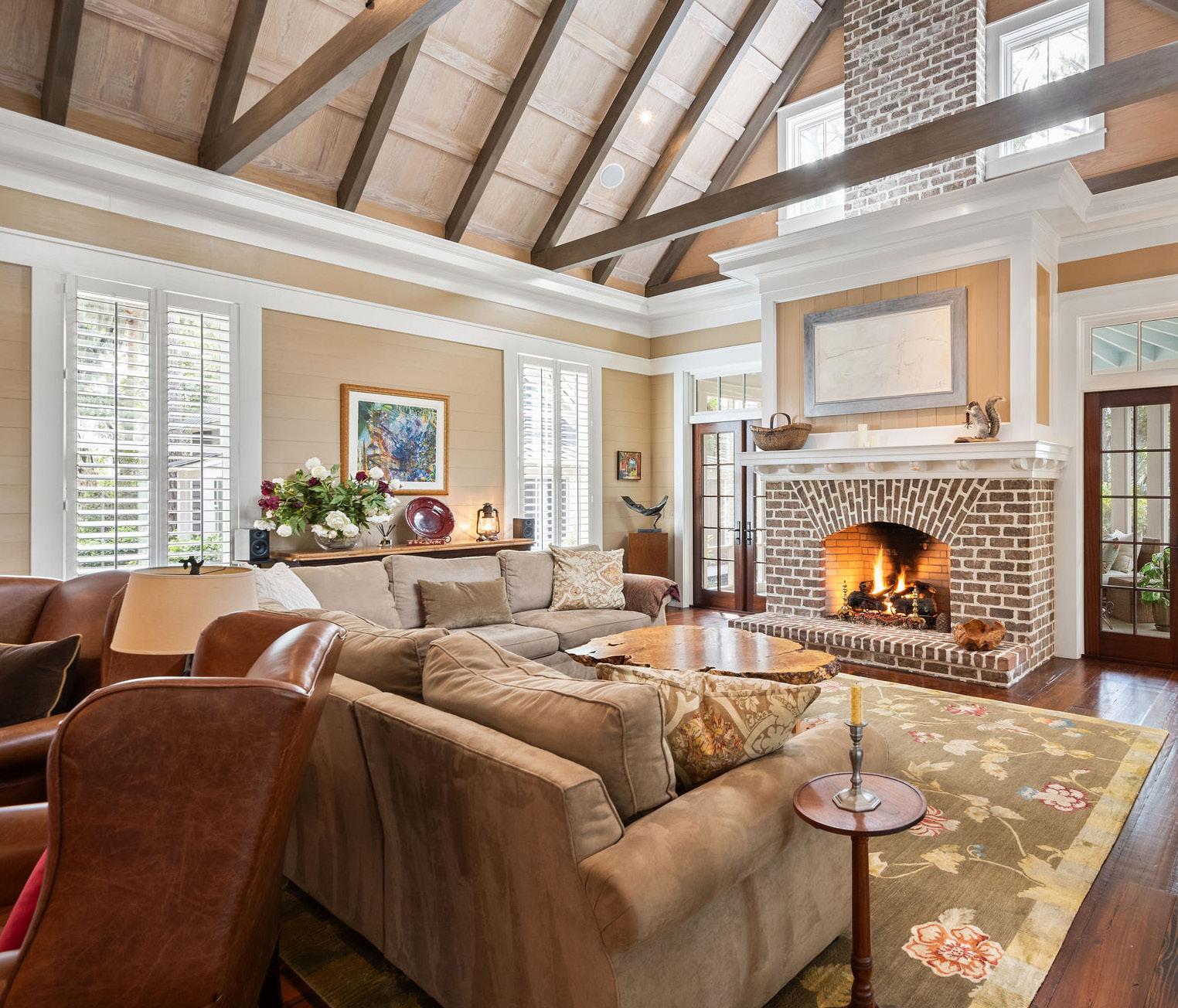 This grand Lowcountry Great Room embodies timeless Southern elegance reimagined for modern living. Anchored by a stately brick fireplace framed in custom millwork, the space rises to vaulted ceilings with exposed beams that draw the eye upward.
