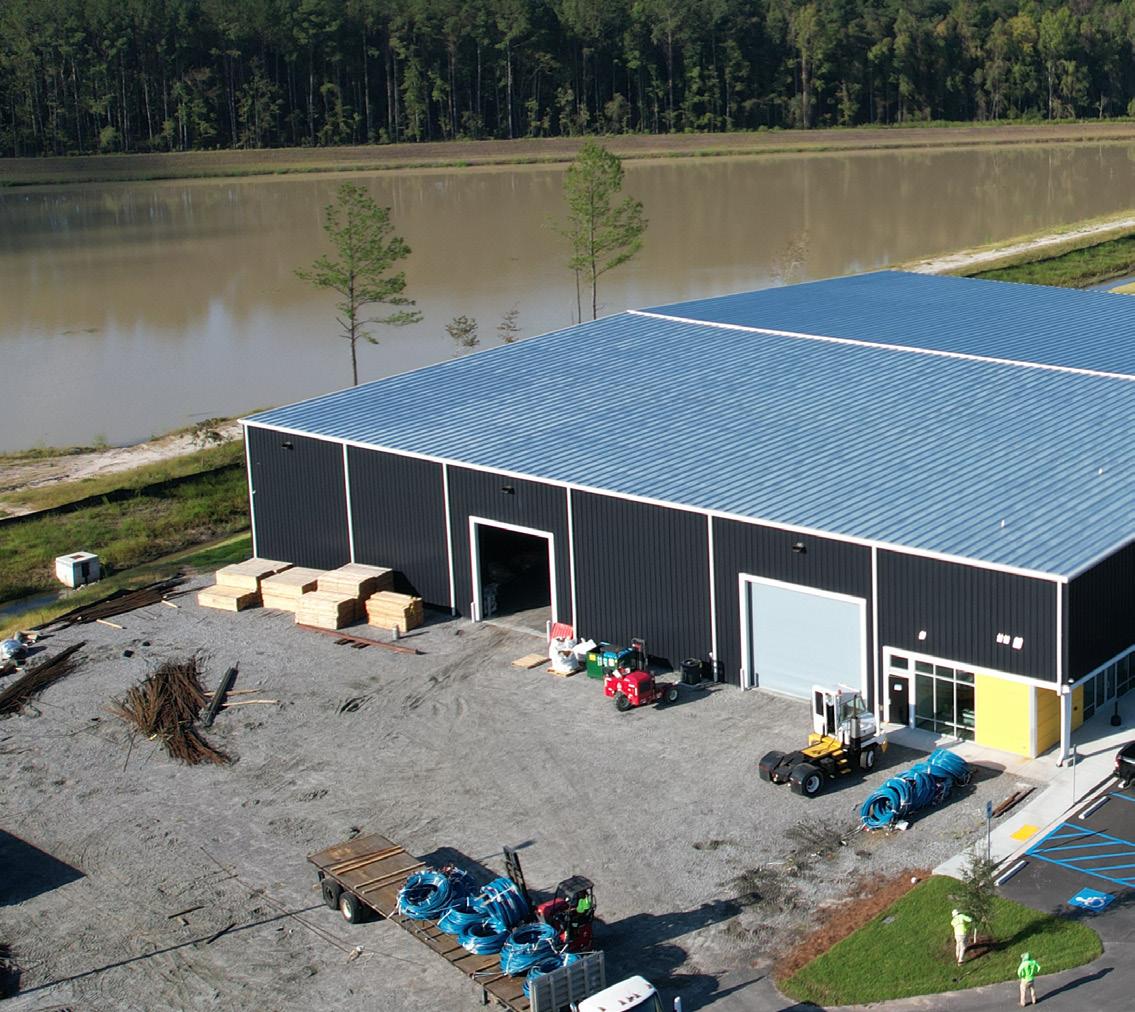 • A clear span, PEMB with 21' clear height and standing seam roof.