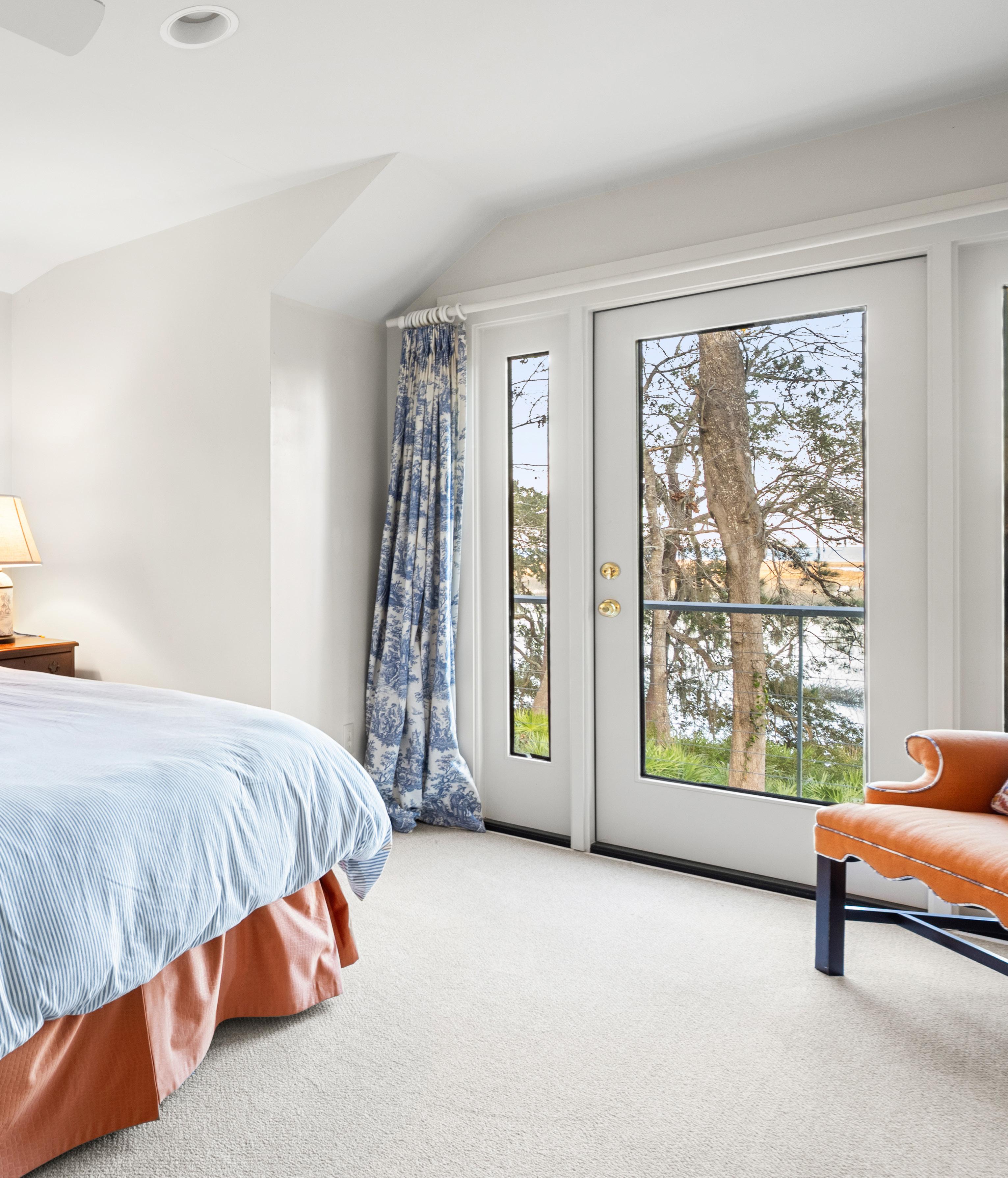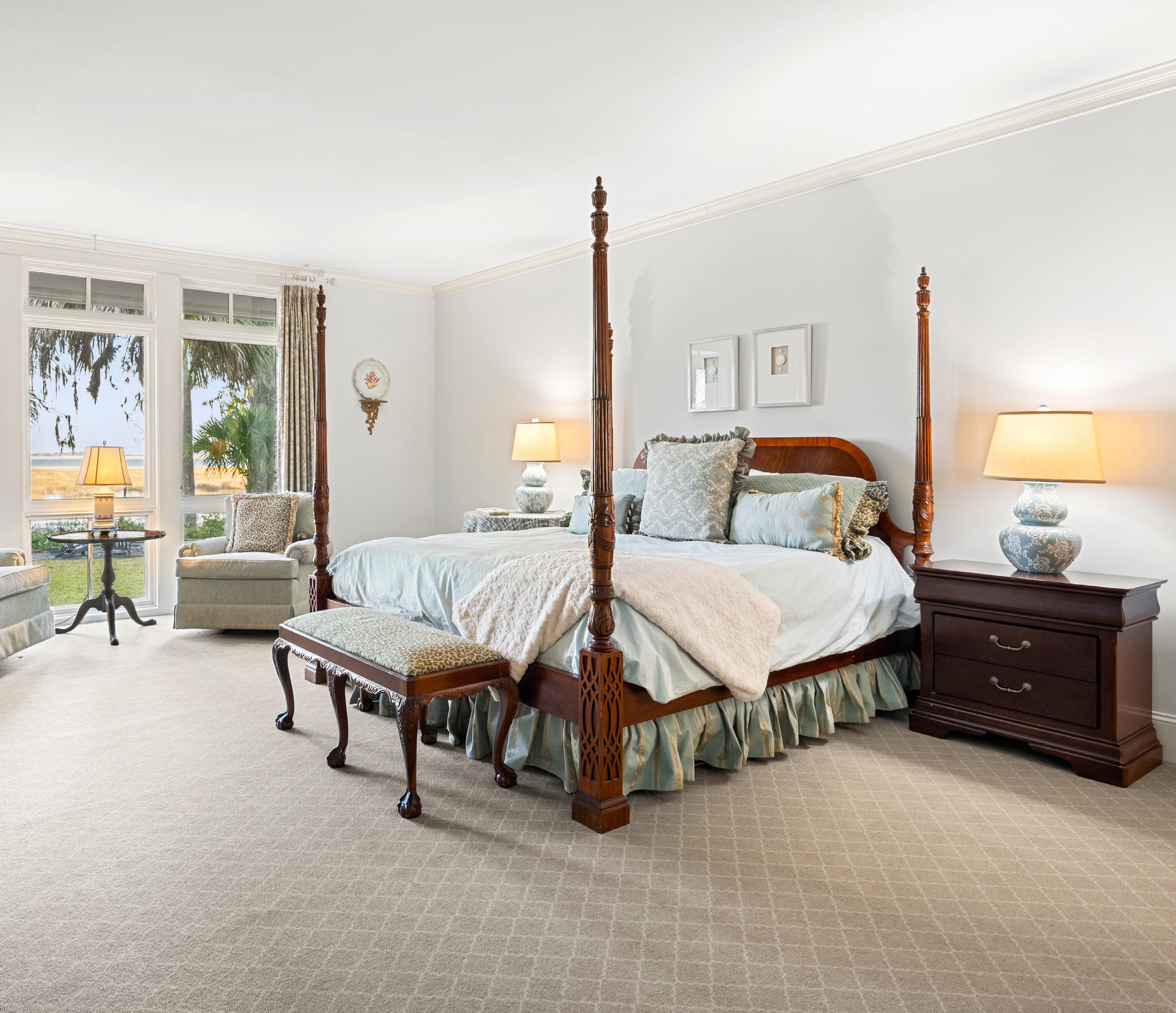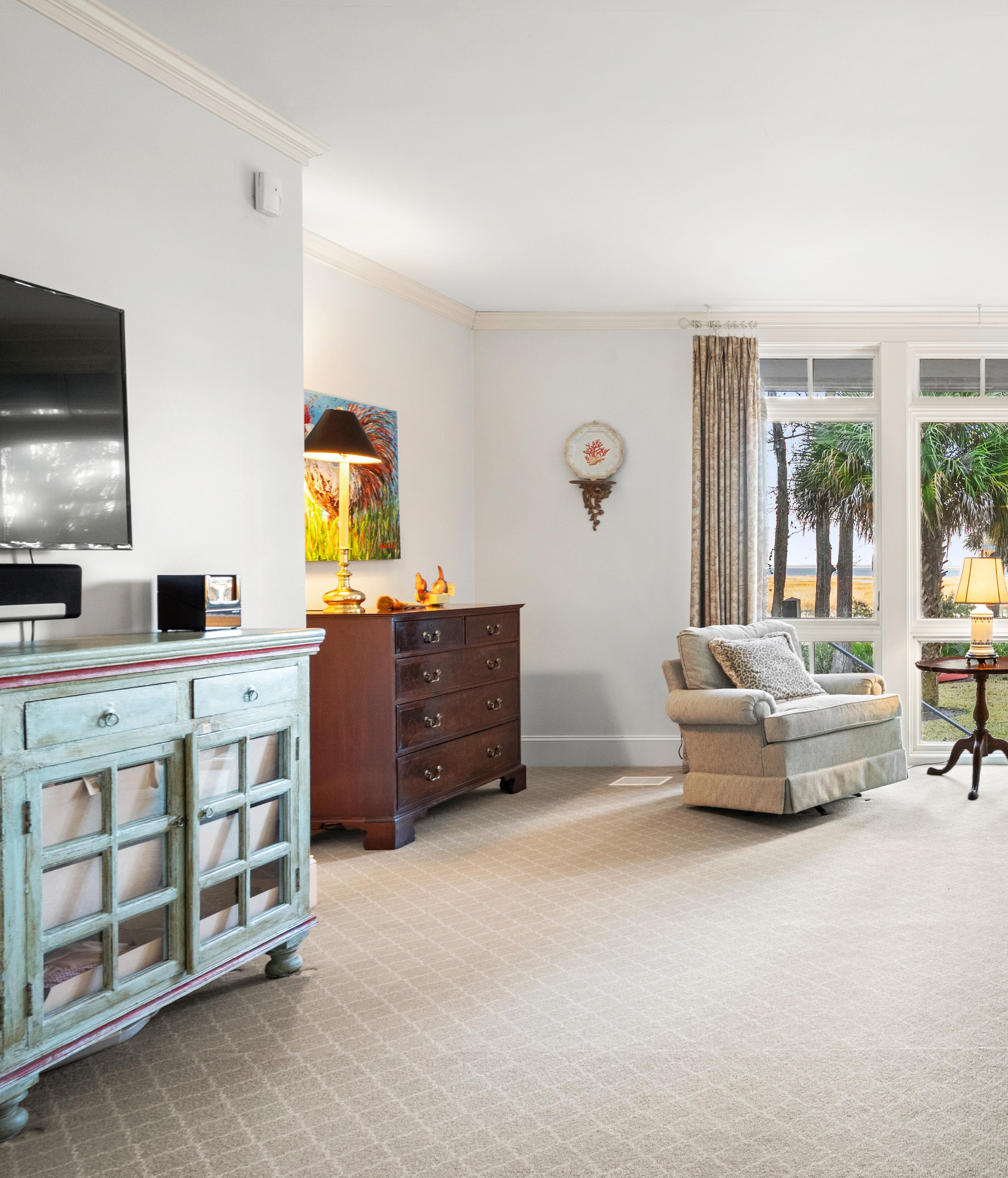 The primary suite is a serene retreat, defined by generous proportions, soft natural light, and tranquil marsh views just beyond the windows. The spa-inspired bath offers a sense of quiet luxury with marble finishes, a glass-enclosed shower, and a soaking tub positioned for peaceful moments of pause. Thoughtfully designed and effortlessly elegant, this suite embodies Lowcountry living at its most refined.