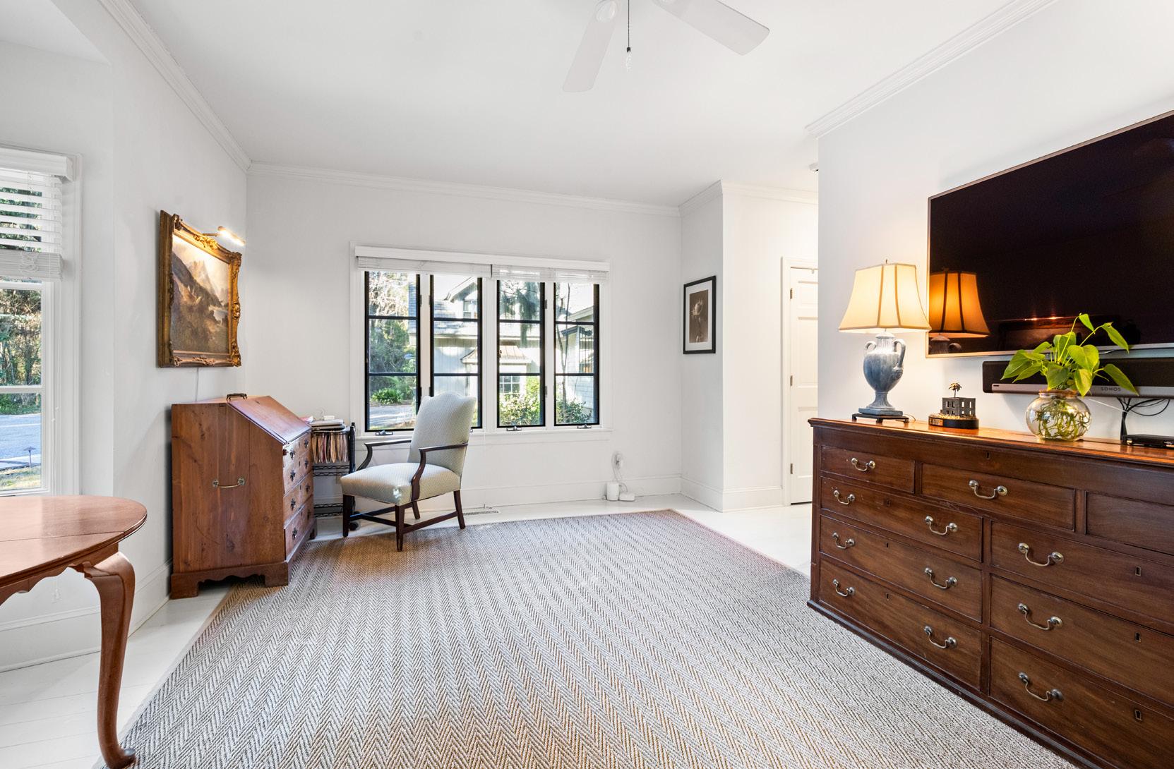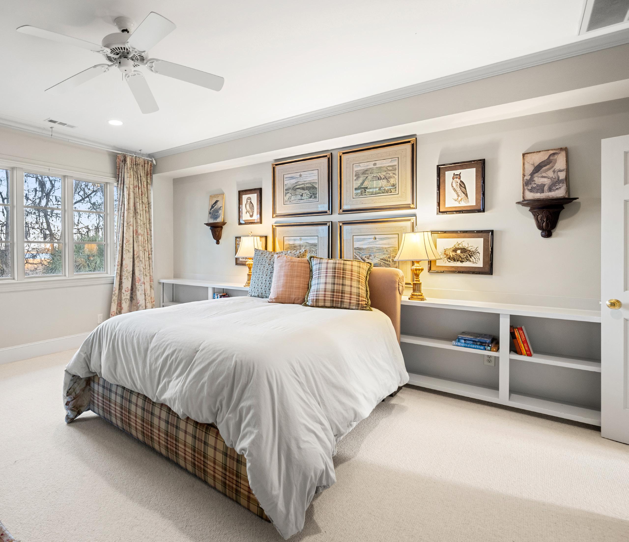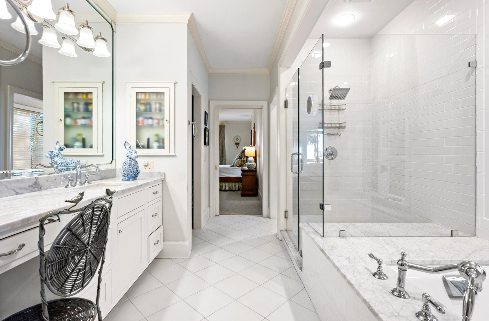 The primary suite is a serene retreat, defined by generous proportions, soft natural light, and tranquil marsh views just beyond the windows. The spa-inspired bath offers a sense of quiet luxury with marble finishes, a glass-enclosed shower, and a soaking tub positioned for peaceful moments of pause. Thoughtfully designed and effortlessly elegant, this suite embodies Lowcountry living at its most refined.