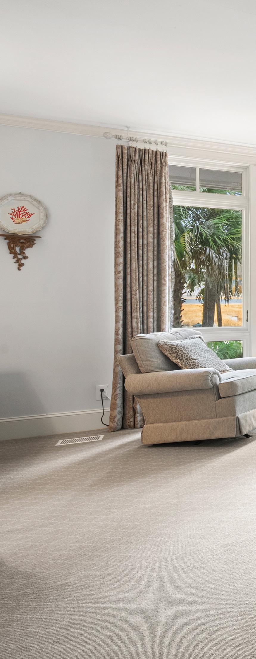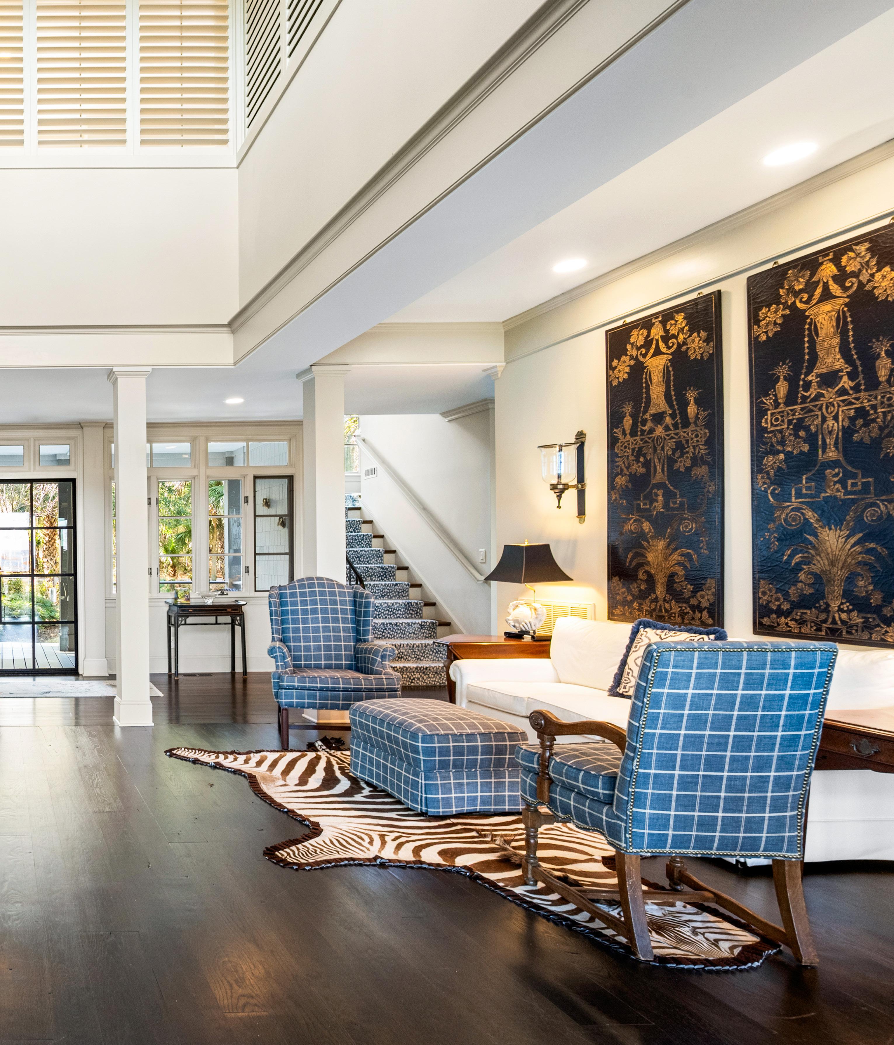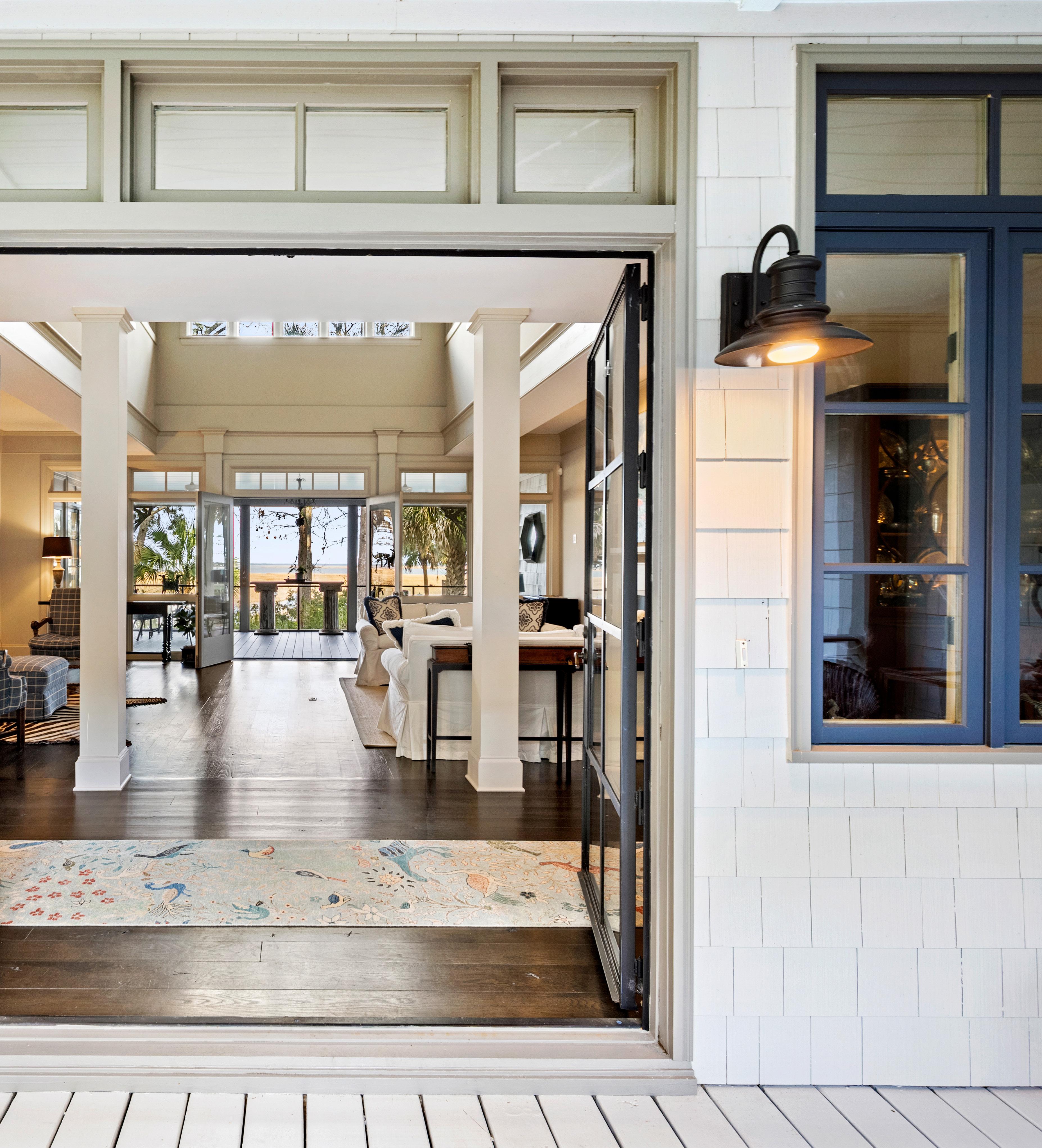 Bathed in natural light, the home’s grand living spaces unfold beneath soaring ceilings and elegant architectural details that feel both timeless and inviting. Wide-plank hardwood floors, classic columns, and thoughtfully curated interiors create a refined Lowcountry aesthetic with a relaxed coastal rhythm. Multiple seating areas flow effortlessly toward expansive glass doors, blurring the line between indoors and out while framing serene views beyond. It’s a home designed for gracious entertaining and quiet moments alike - polished, welcoming, and deeply rooted in Southern charm.