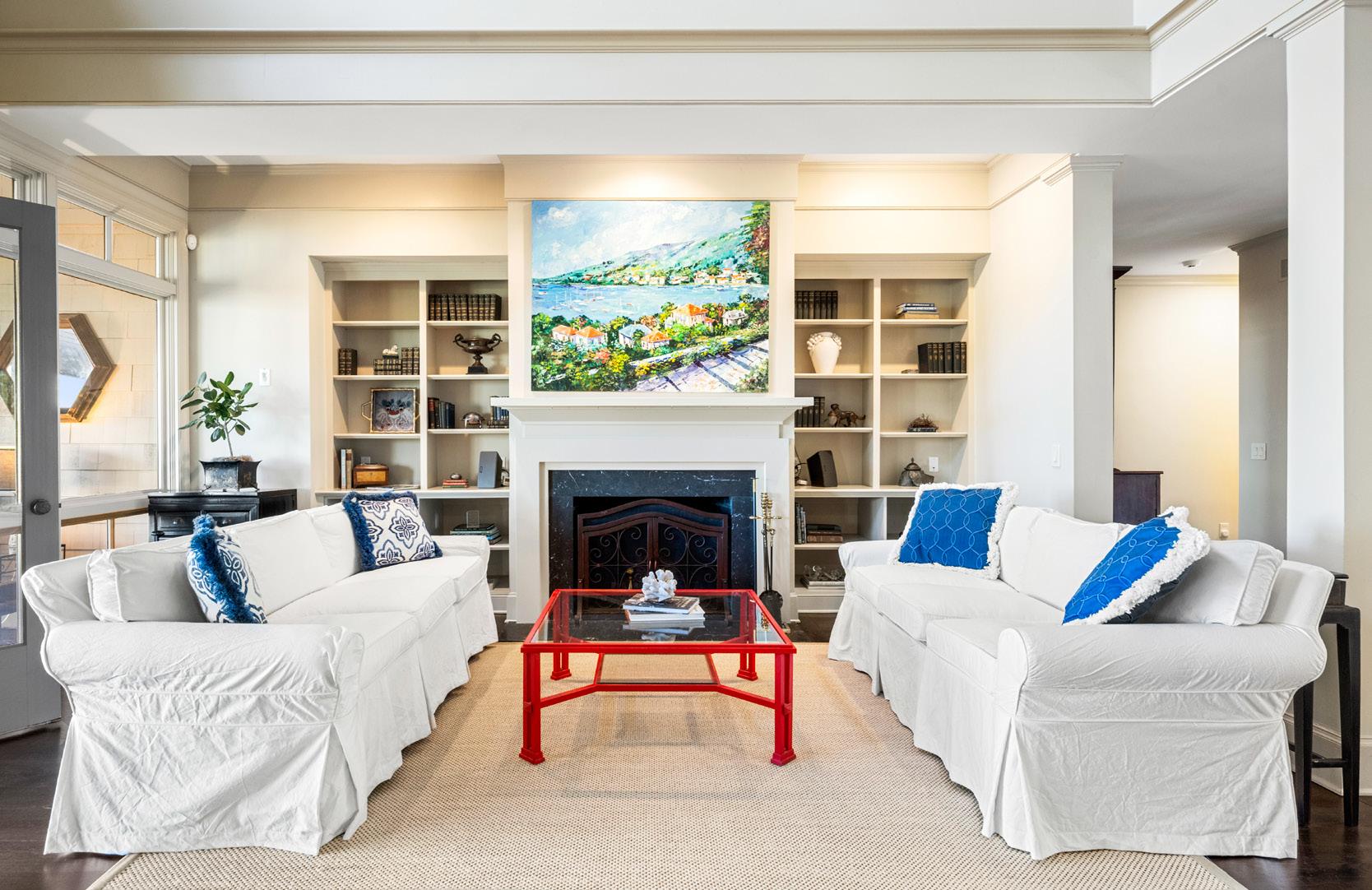 A defining feature of the home’s design is the way river views are intentionally drawn through the center of the residence. The great room showcases reclaimed wood flooring, a soapstone fireplace with custom built-ins, and large windows that frame the surrounding landscape. This space opens directly to a four-season screened porch, perfectly positioned to capture sweeping marsh and river views.