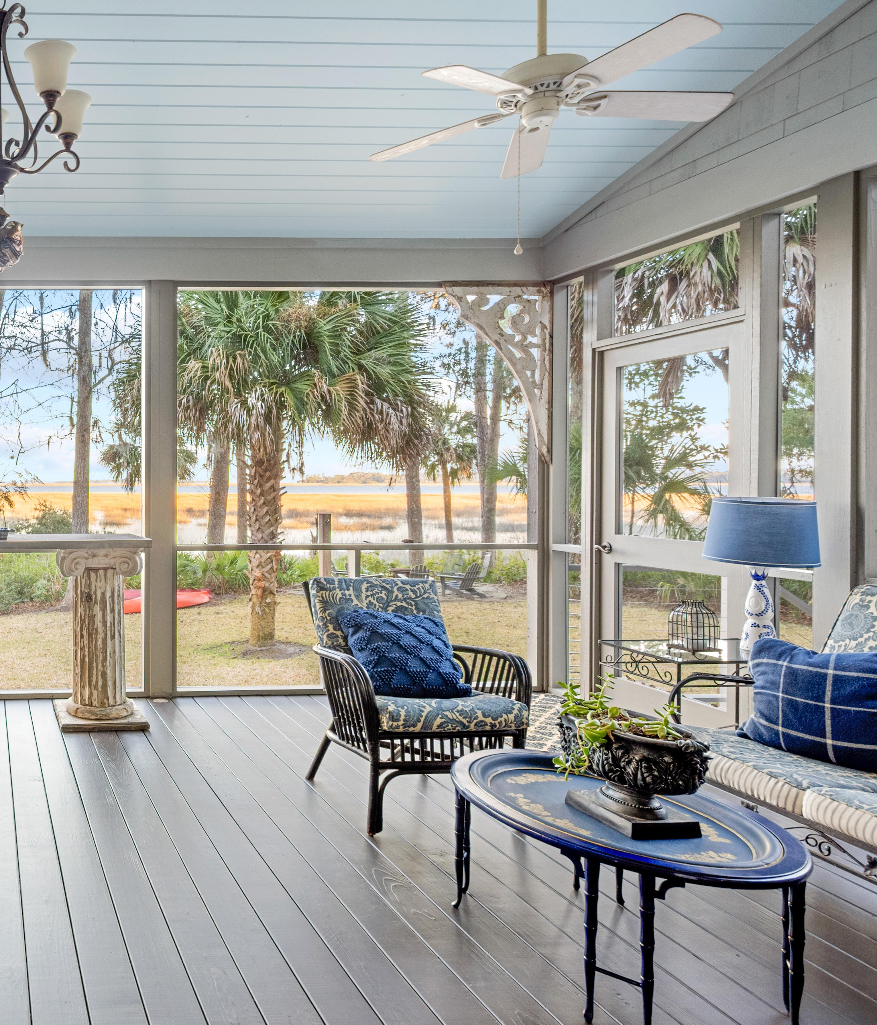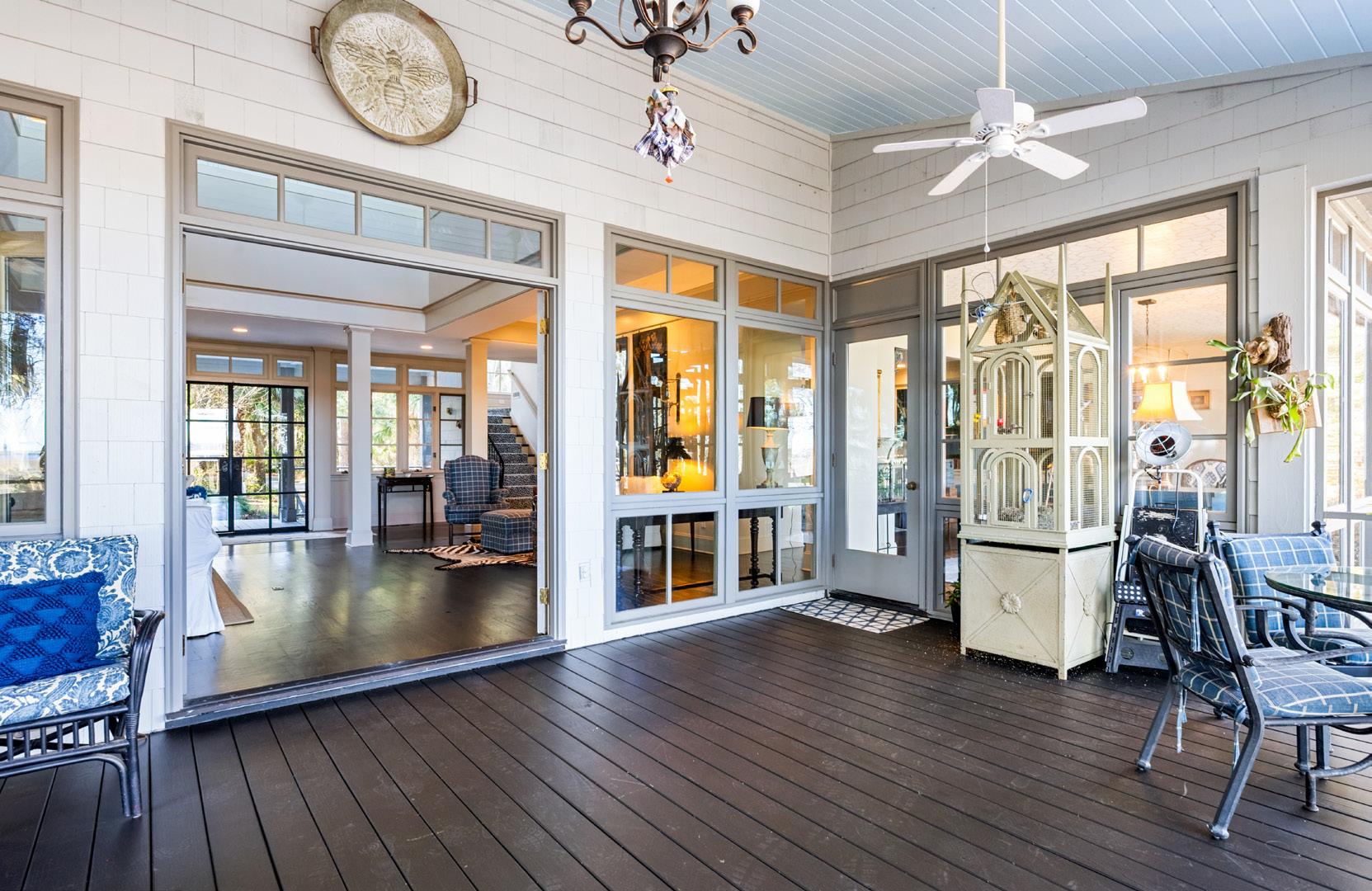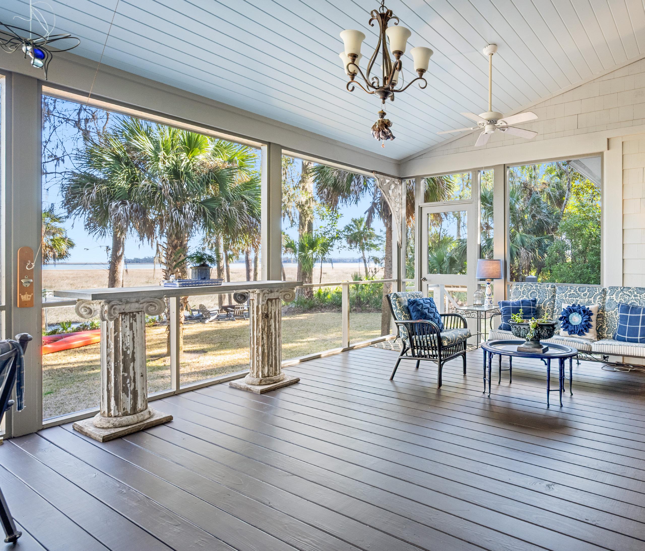 The outdoor living spaces are a true extension of the home, thoughtfully designed to embrace the surrounding marsh and coastal landscape. The expansive screened porch offers multiple seating and dining areas, perfectly suited for quiet mornings or evenings spent entertaining with the breeze drifting through. Classic architectural details, soft coastal hues, and ceiling fans create an inviting atmosphere that feels both refined and relaxed. With panoramic views and seamless indoor-outdoor flow, these spaces capture the essence of Lowcountry living at its finest.