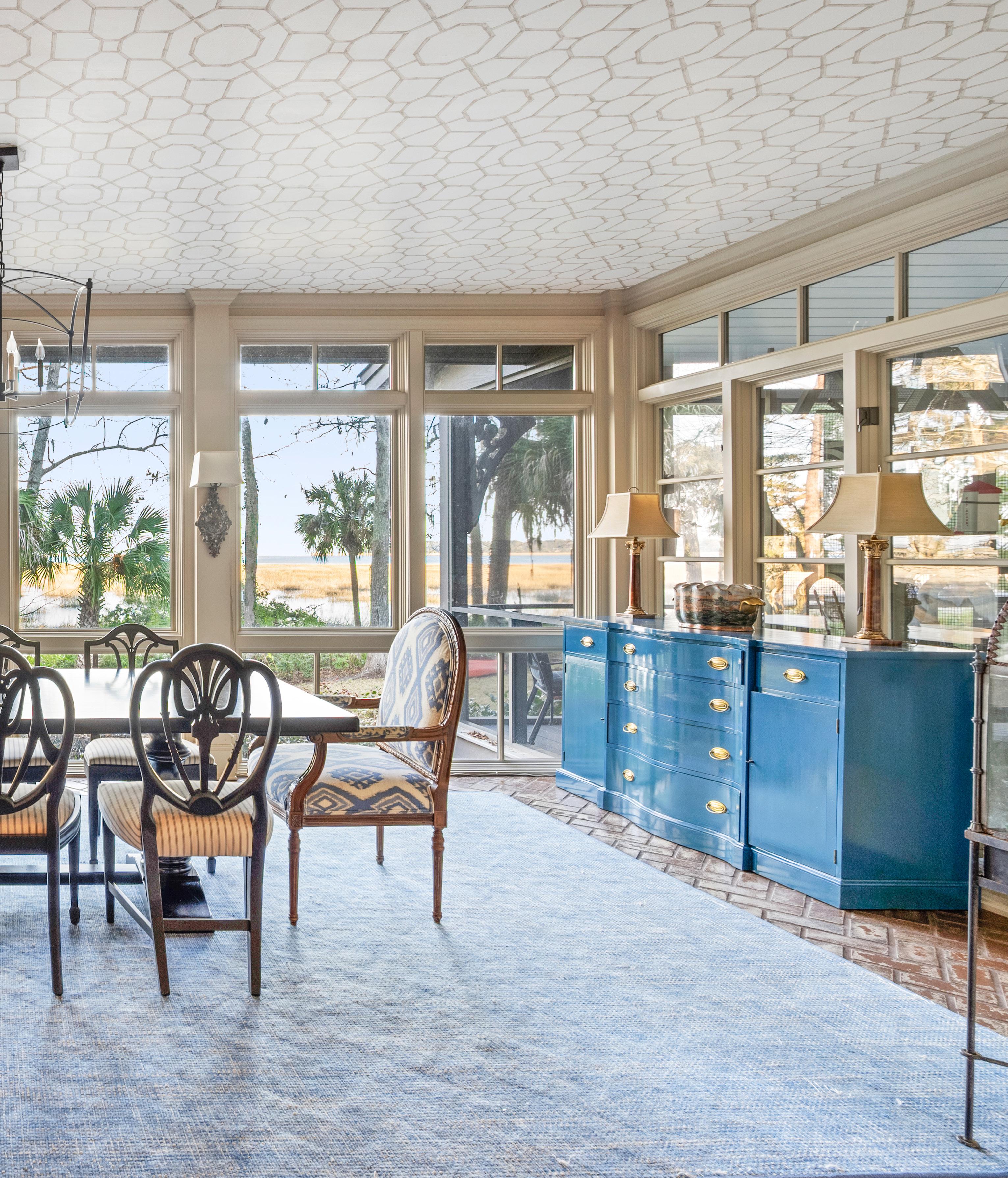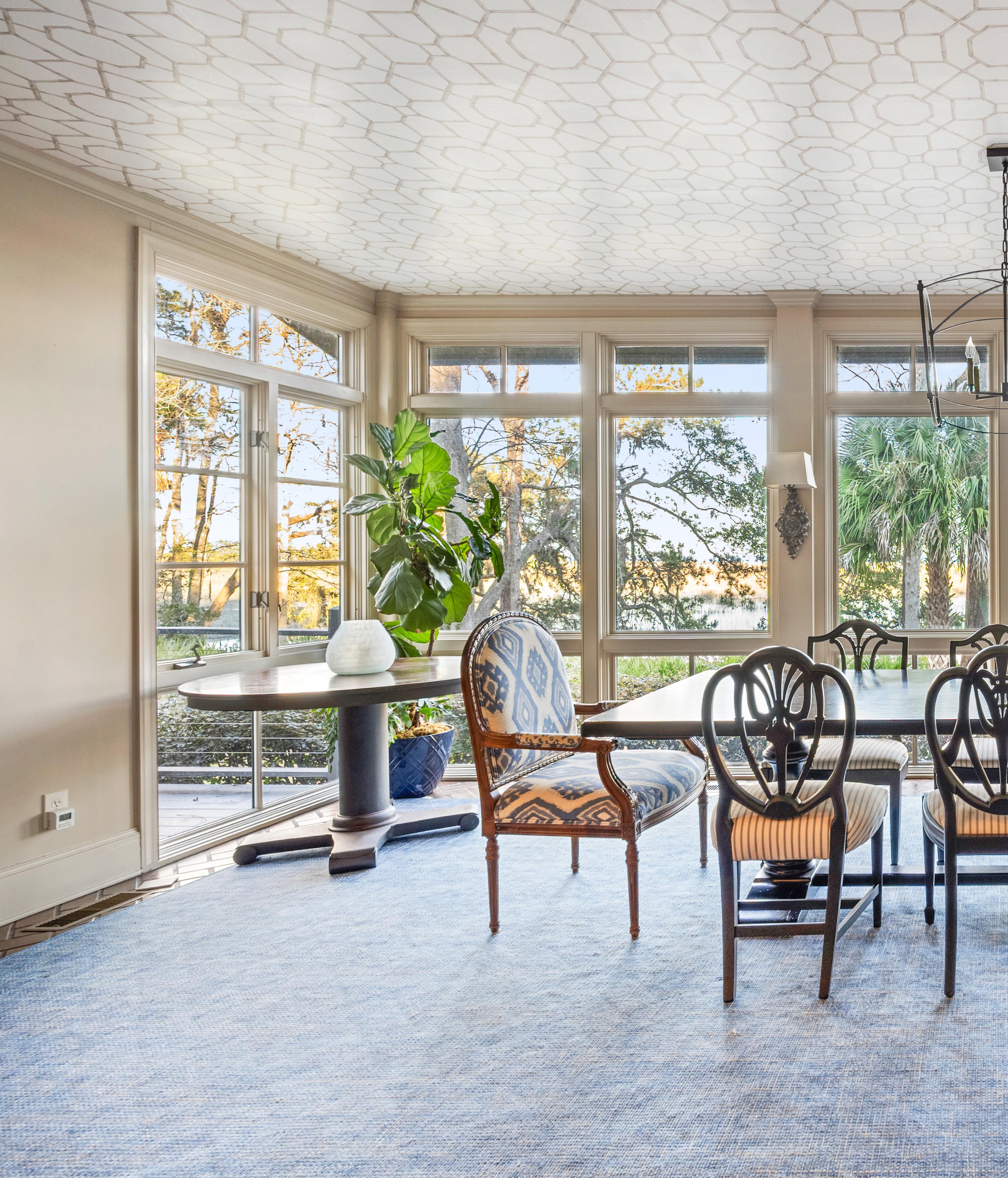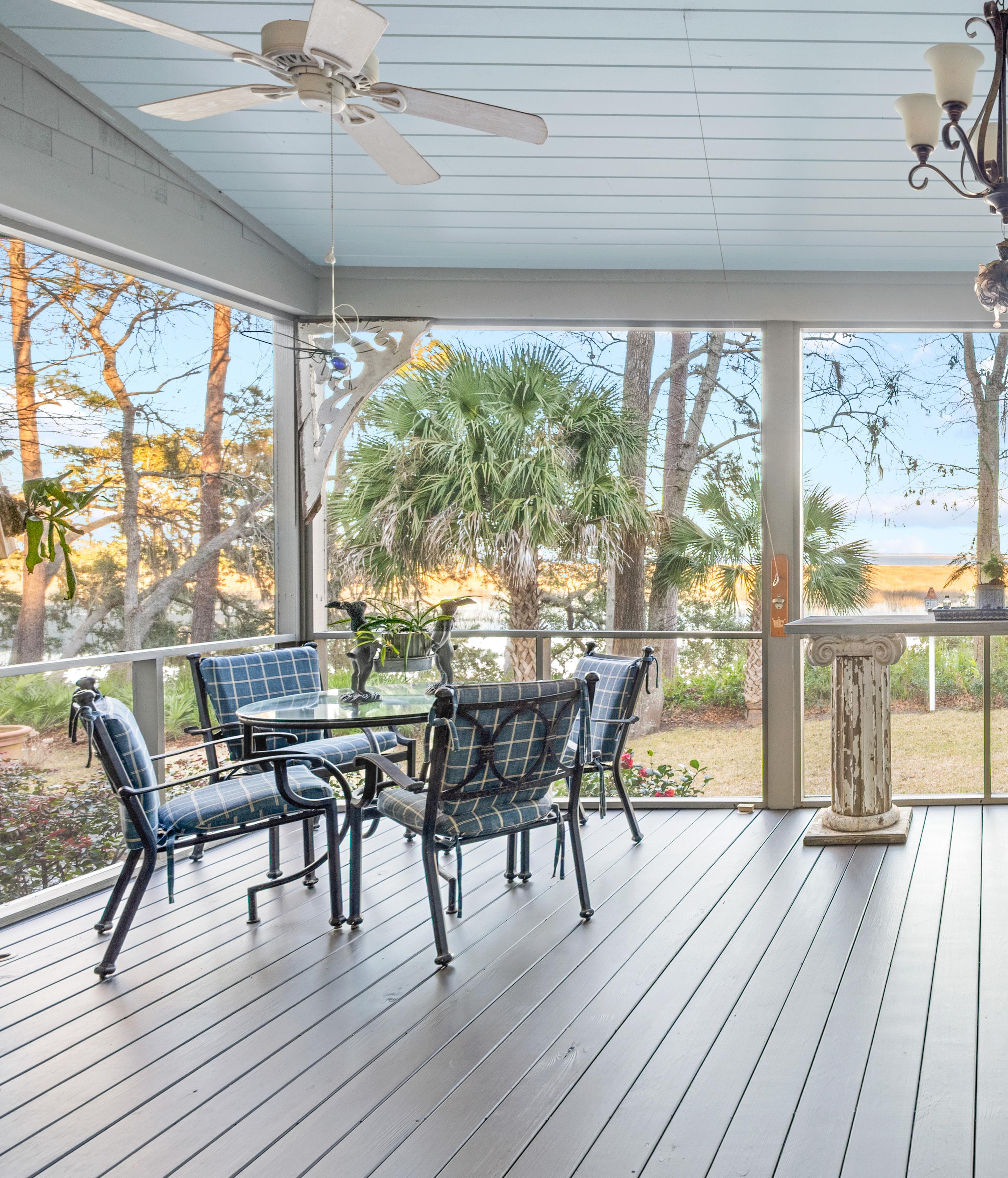 The outdoor living spaces are a true extension of the home, thoughtfully designed to embrace the surrounding marsh and coastal landscape. The expansive screened porch offers multiple seating and dining areas, perfectly suited for quiet mornings or evenings spent entertaining with the breeze drifting through. Classic architectural details, soft coastal hues, and ceiling fans create an inviting atmosphere that feels both refined and relaxed. With panoramic views and seamless indoor-outdoor flow, these spaces capture the essence of Lowcountry living at its finest.