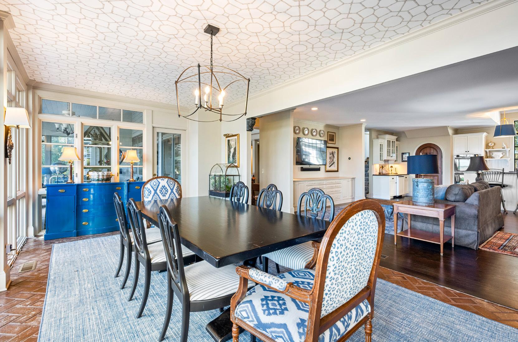 The dining room flows into an open den and the kitchen, creating an ideal layout for entertaining. The kitchen features leathered granite countertops, a wood-topped center island with induction cooktop, custom cabinetry with a paneled refrigerator, a wet bar, and a concealed 500-bottle temperature-controlled wine cellar. A secondary back kitchen and laundry area, hidden behind a sliding barn door, lead to a grilling patio for added convenience. An expansive artist’s studio with separate HVAC and French doors opening to the gardens and river is located on the main level, offering flexible space for creative work, a home office, or additional living area. This wing also provides access to the two-car garage with golf cart bay.