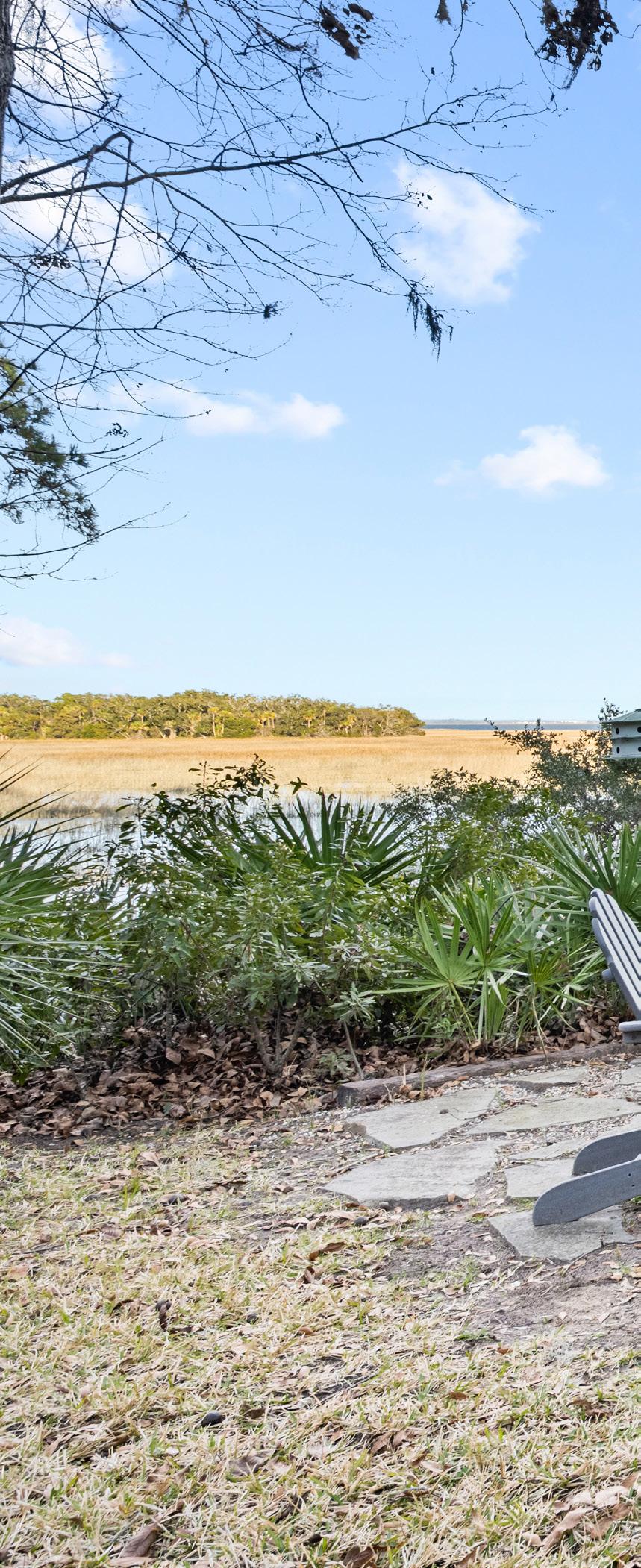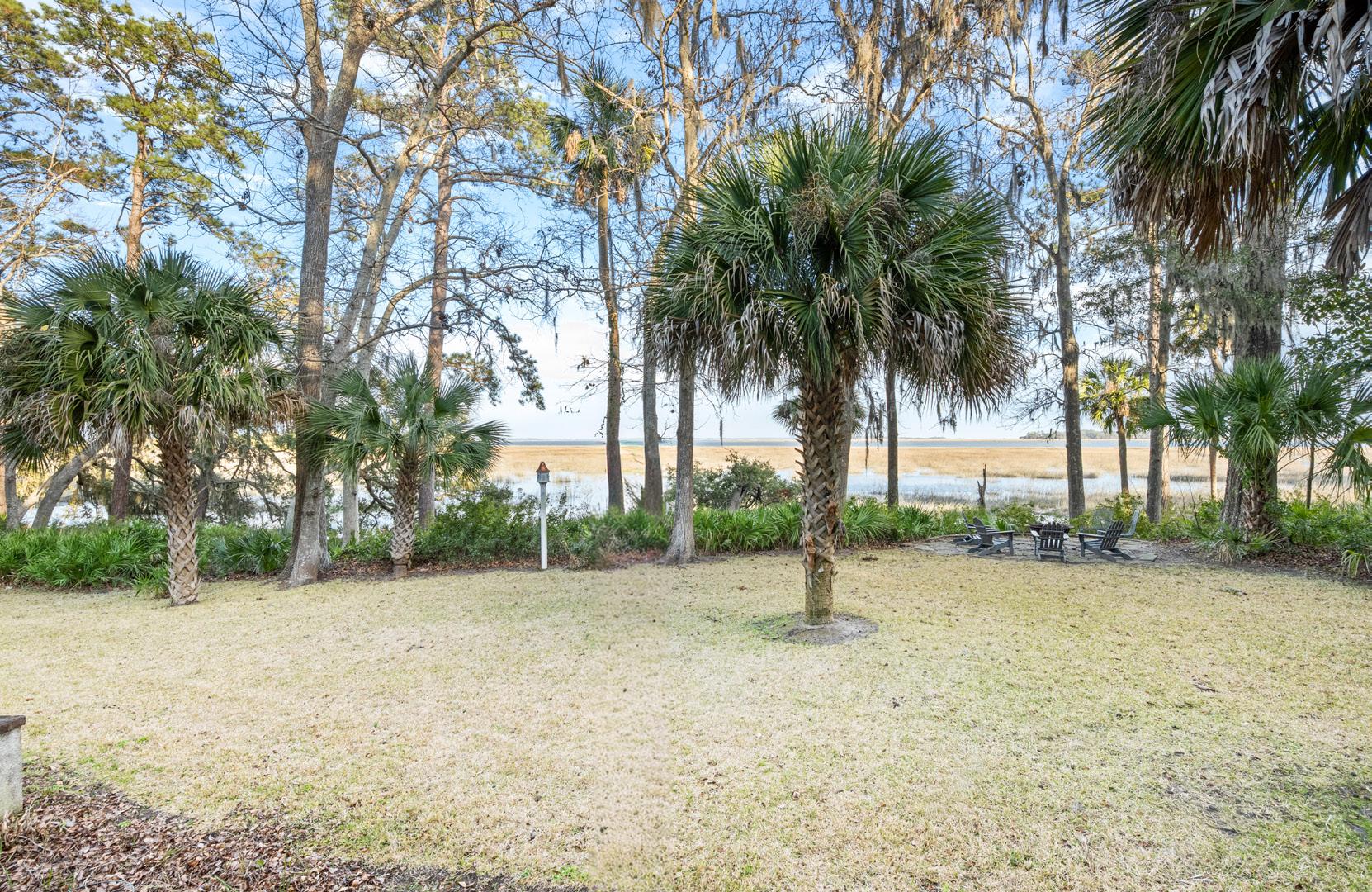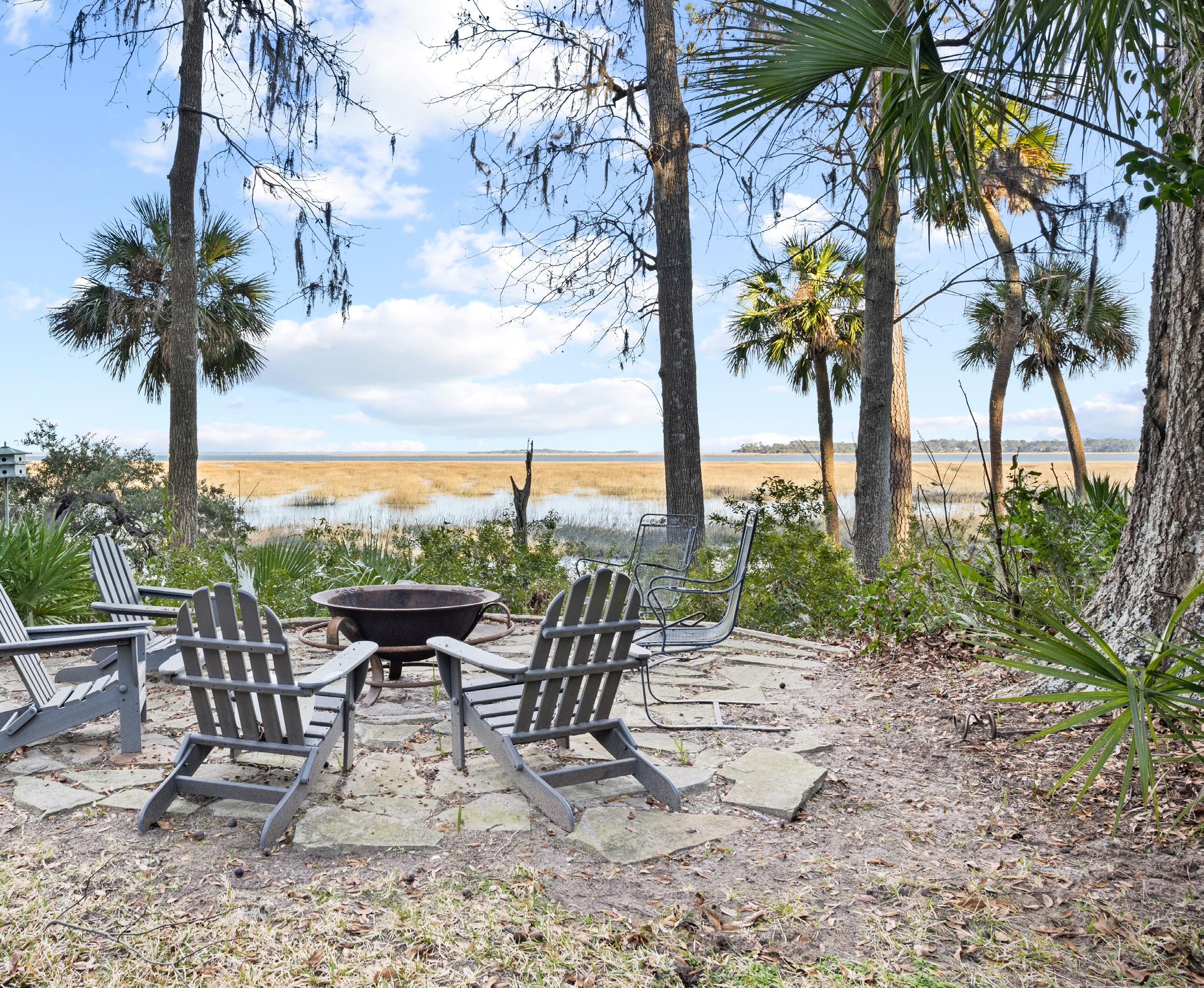 Set against a breathtaking backdrop of tidal marsh and open sky, the grounds invite quiet moments of reflection and additional effortless outdoor living. A thoughtfully placed fire pit creates a natural gathering spot, perfect for evenings spent under the stars with the sounds of the Lowcountry all around. Meandering paths and layered native landscaping lead the eye toward expansive water views, where the landscape shifts beautifully with the tides. This serene setting captures the timeless beauty of coastal South Carolina, offering a rare sense of privacy and connection to nature.