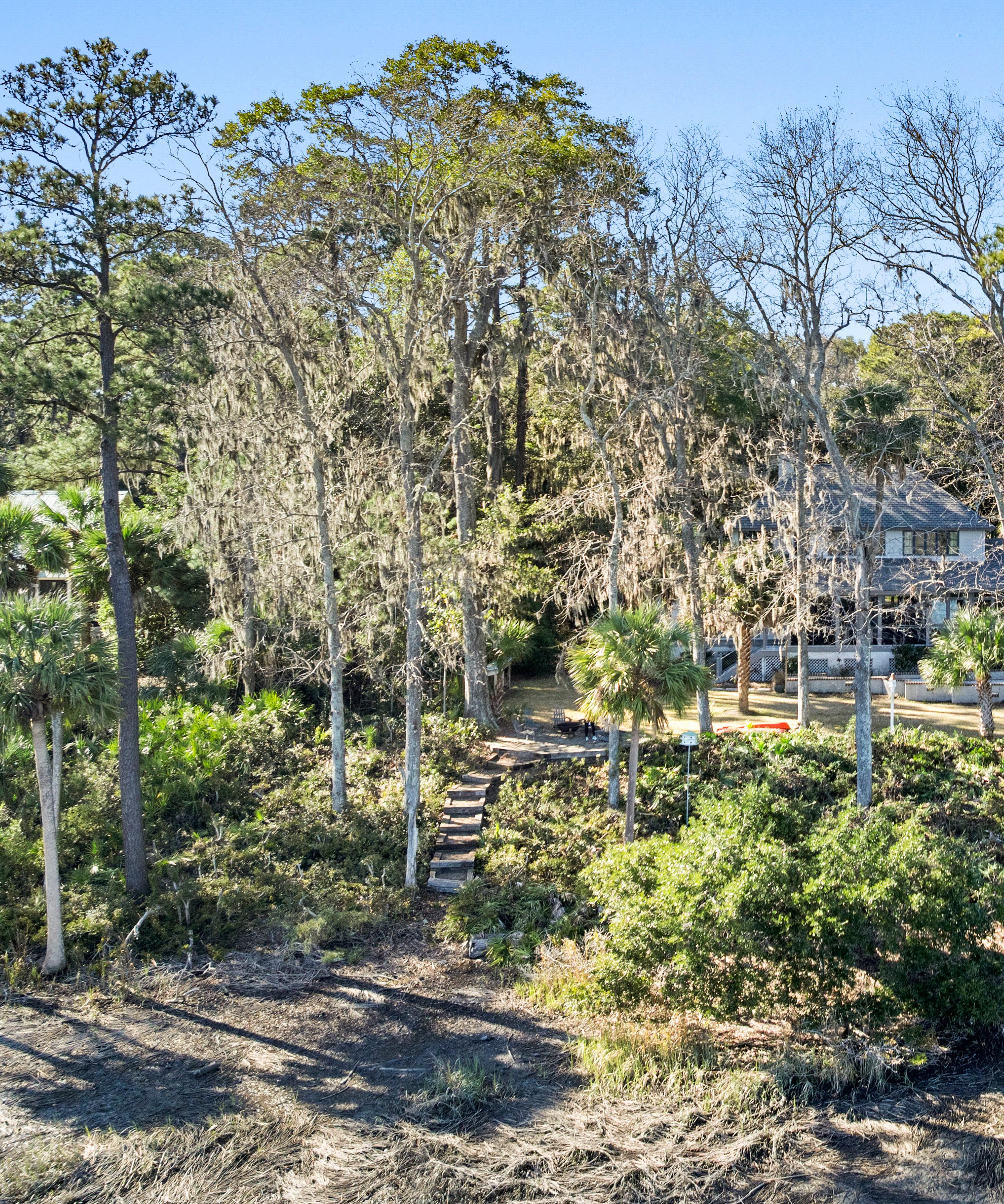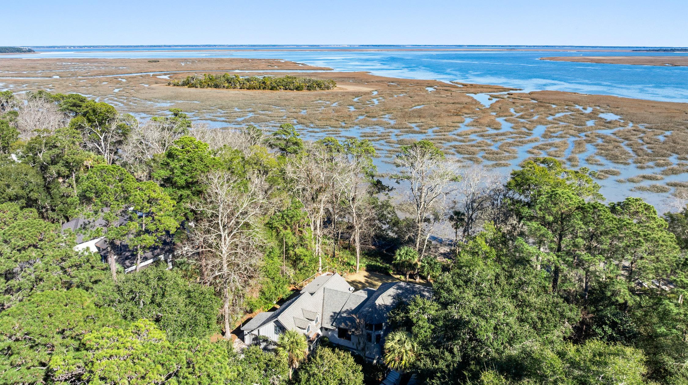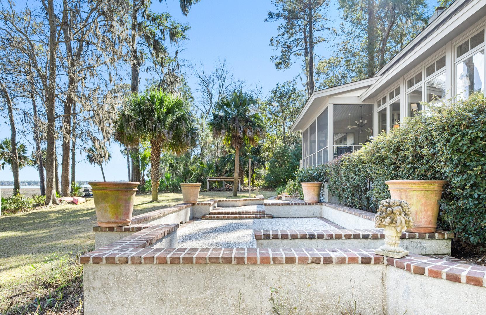 Set against a breathtaking backdrop of tidal marsh and open sky, the grounds invite quiet moments of reflection and additional effortless outdoor living. A thoughtfully placed fire pit creates a natural gathering spot, perfect for evenings spent under the stars with the sounds of the Lowcountry all around. Meandering paths and layered native landscaping lead the eye toward expansive water views, where the landscape shifts beautifully with the tides. This serene setting captures the timeless beauty of coastal South Carolina, offering a rare sense of privacy and connection to nature.