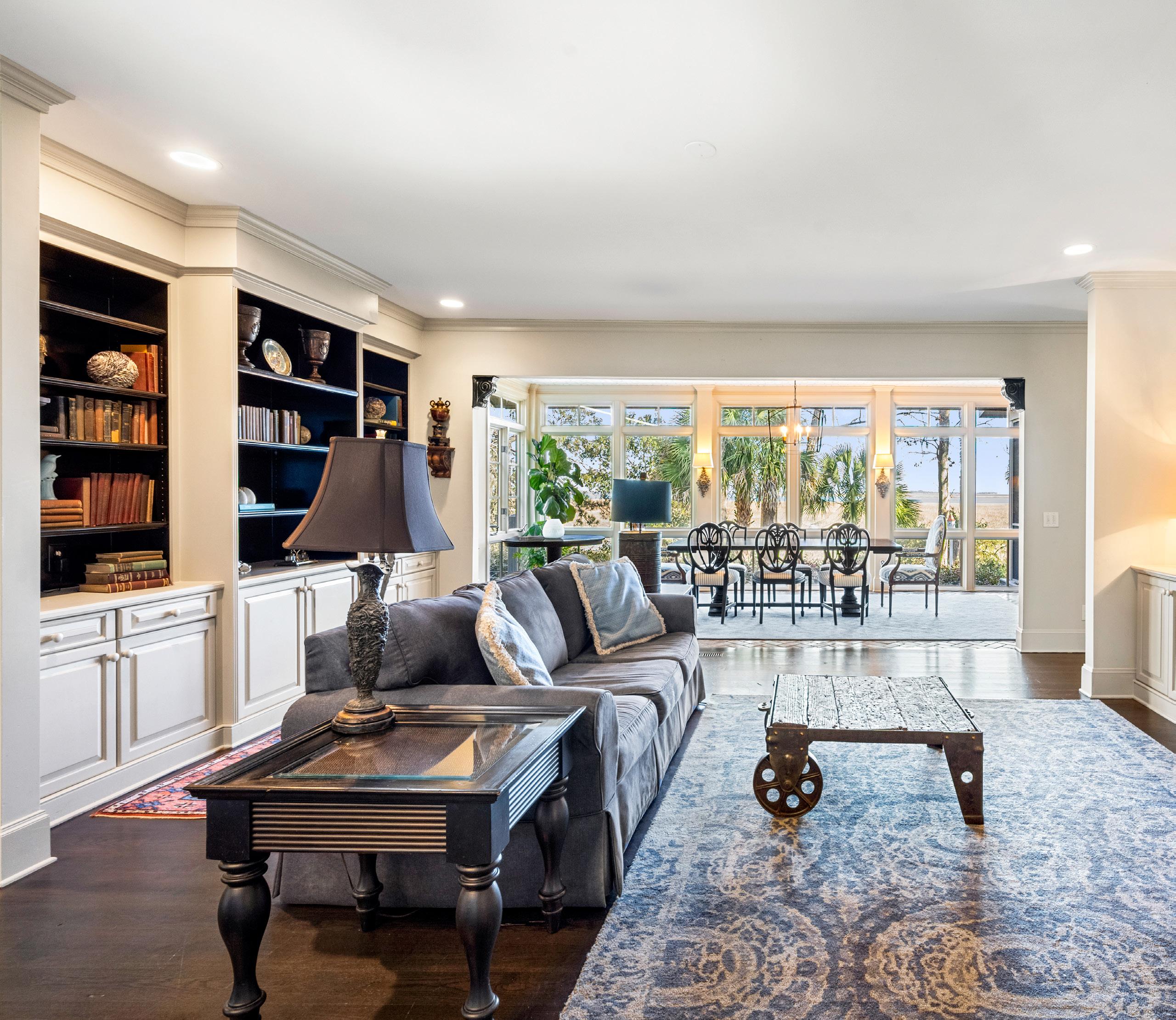 These inviting living and dining spaces are designed to gather, unwind, and entertain with effortless grace. Custom built-ins, warm hardwood floors, and layered lighting create a sense of comfort while maintaining a refined, timeless aesthetic. Walls of windows frame sweeping Lowcountry views, drawing the landscape in and filling each room with soft, natural light. From intimate evenings by the fire to memorable dinners overlooking the marsh, every space feels thoughtfully composed and undeniably welcoming.