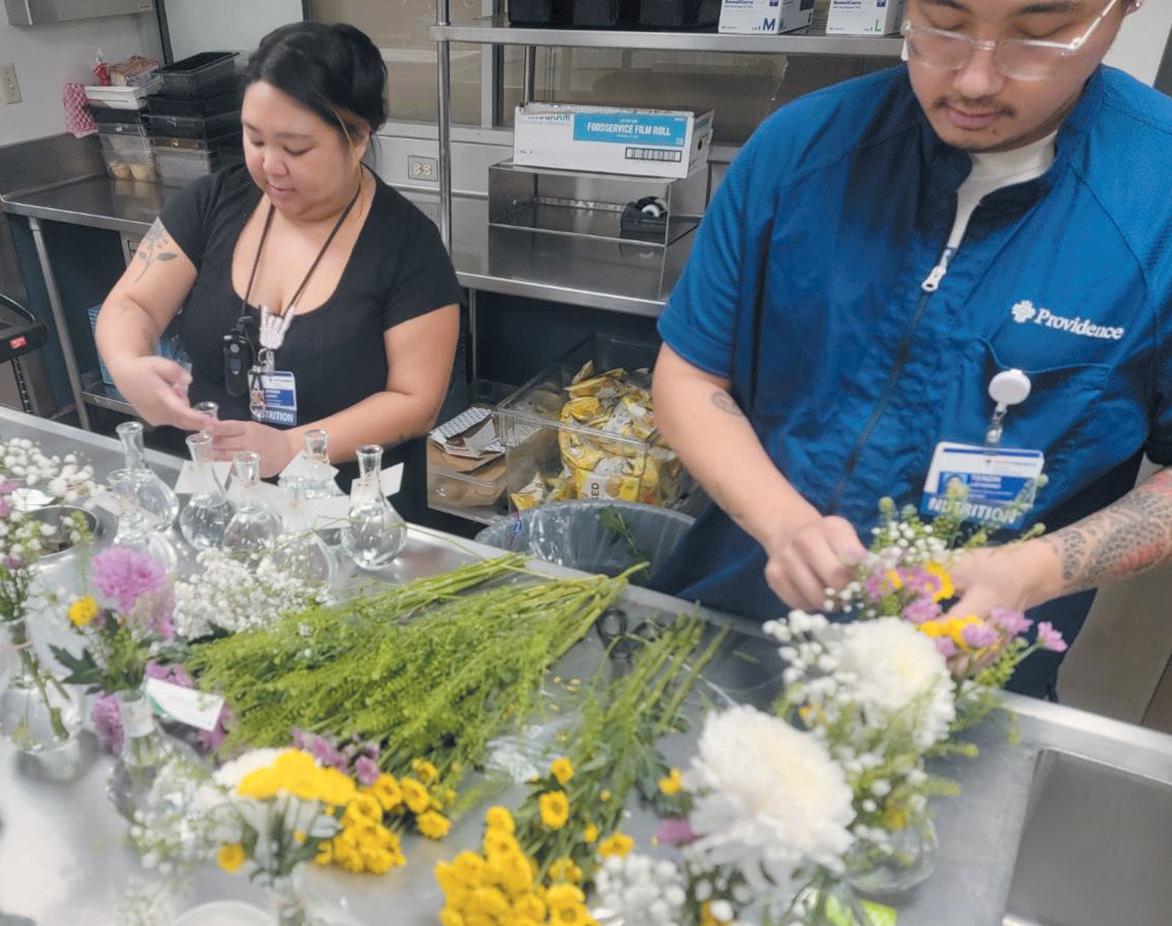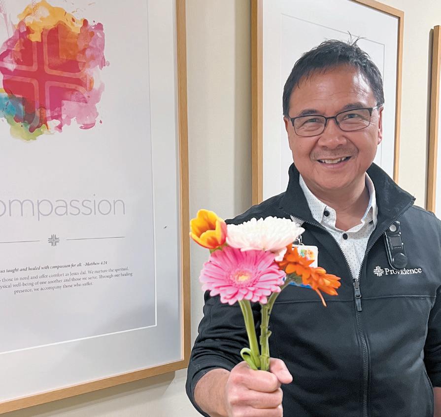 Members of his team identify which patients at the hospital, part of Providence St. Joseph Health, might need an extra boost. Then, they deliver a small vase of flowers to their room.