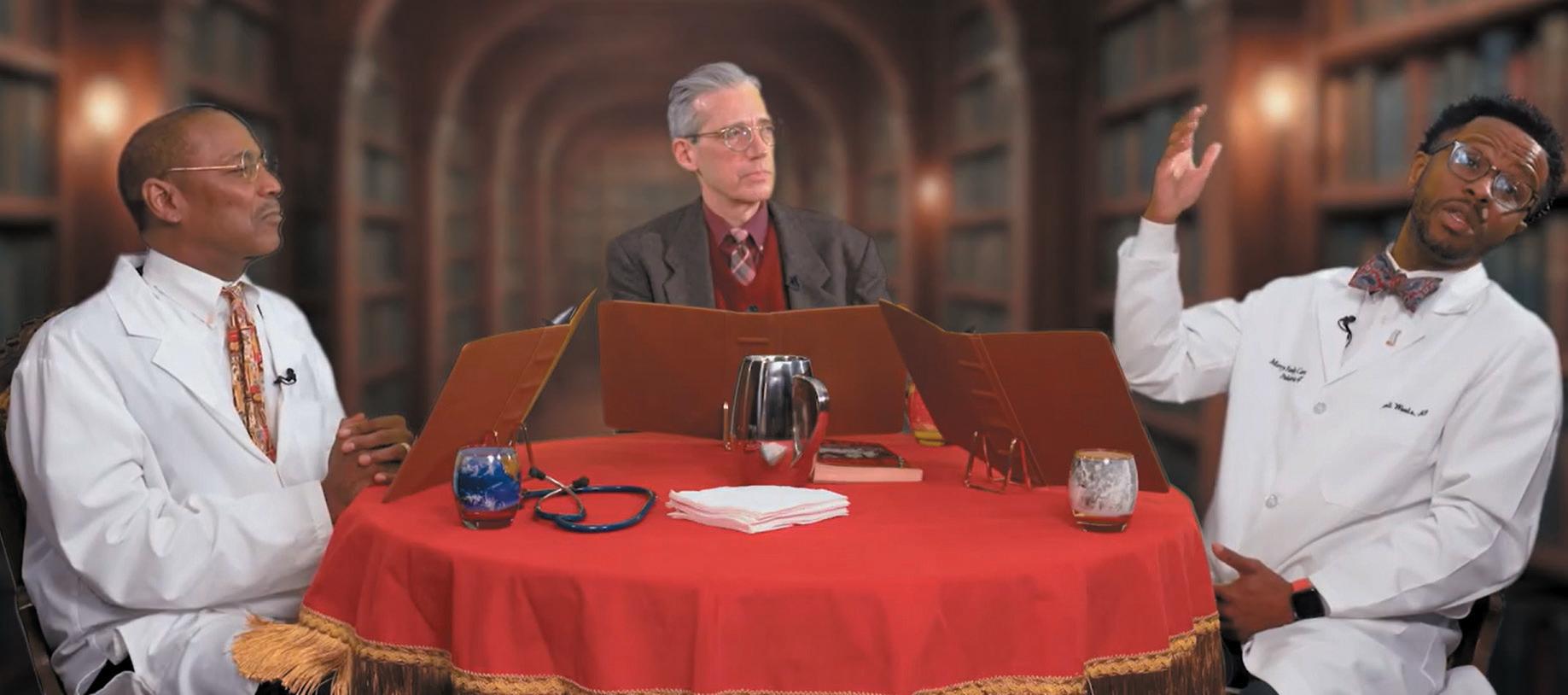 Behind the scenes, Collins came up with the idea for the series, scripted it, hired actors and, in some cases, costumed them, recruited doctors for the series’ panel discussions, and figured out how to have a live audience for taping. In front of the camera, Collins stars as the series’ moderator.