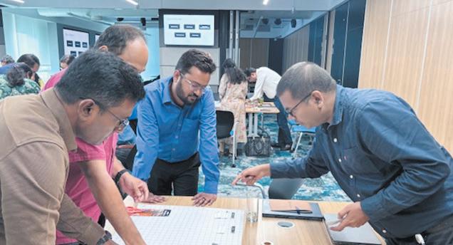 Providence Global Center caregivers, from left, Sreekanth Puttha, Mallikarjun Kulkarni and Nikhil Kumar Singh work on a strategy-forming activity with a puzzle during the Leadership Foundation session on vulnerability. The global center is in Hyderabad, India. Read about how Providence formation programs draw staff in India into the system’s mission at chausa.org/chw.