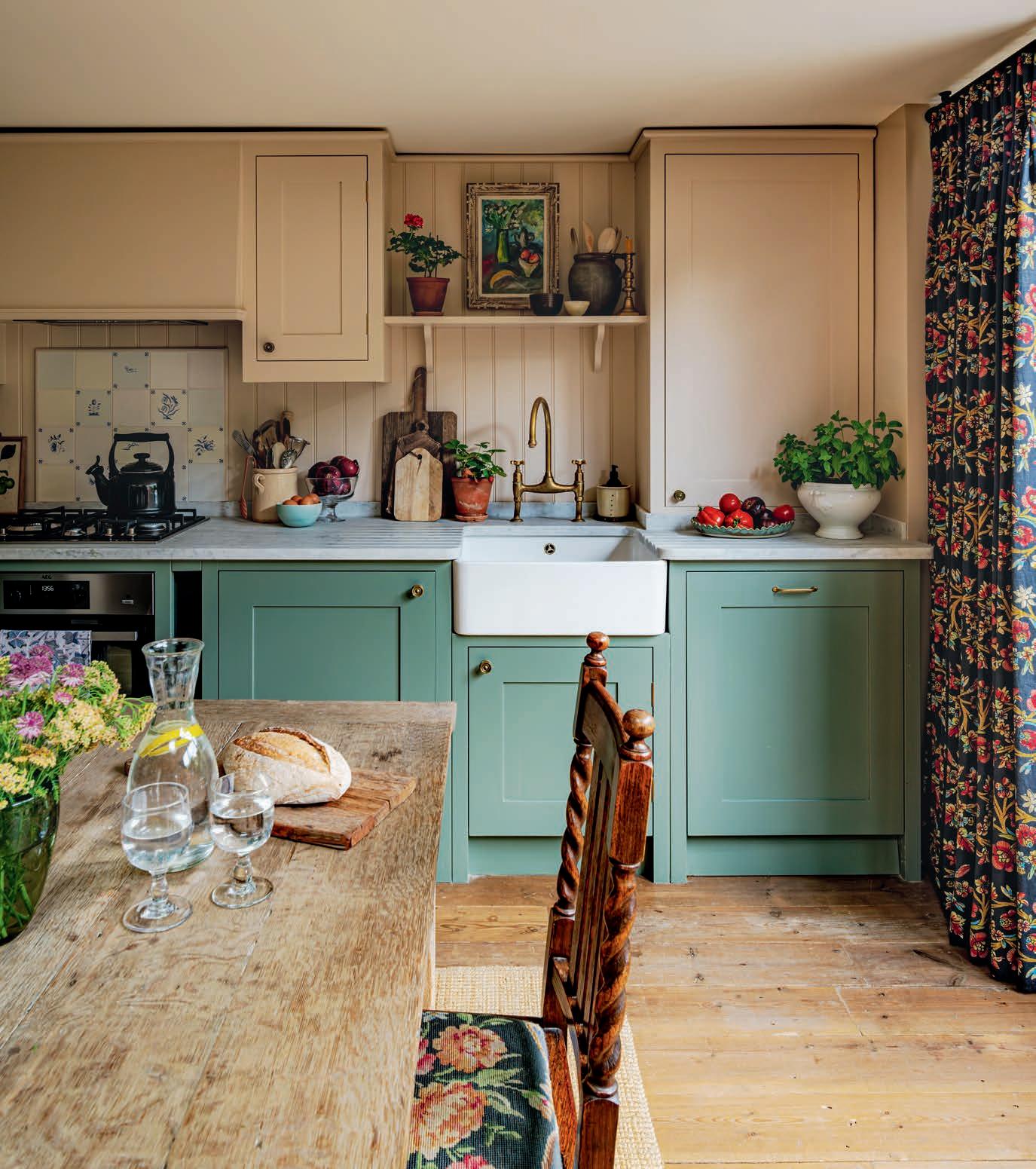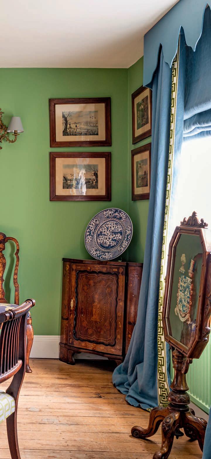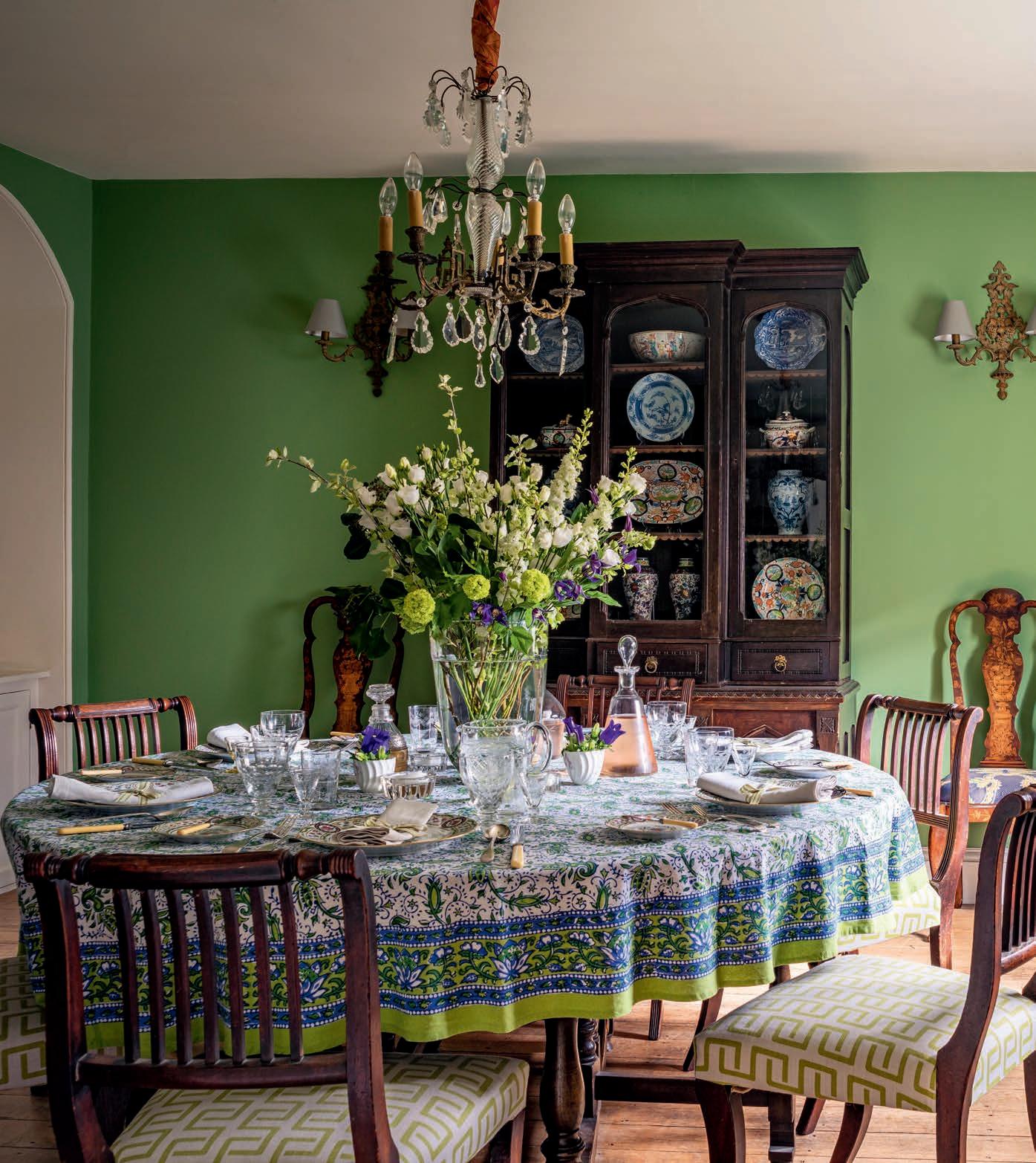 THIS PAGE The walls of the dining room are painted in Chelsea Green by Paint & Paper Library, while the inherited Georgian dining chairs have been reupholstered in Link Beach from Hugh St Clair and the tablecloth was sourced from Faro Home.