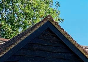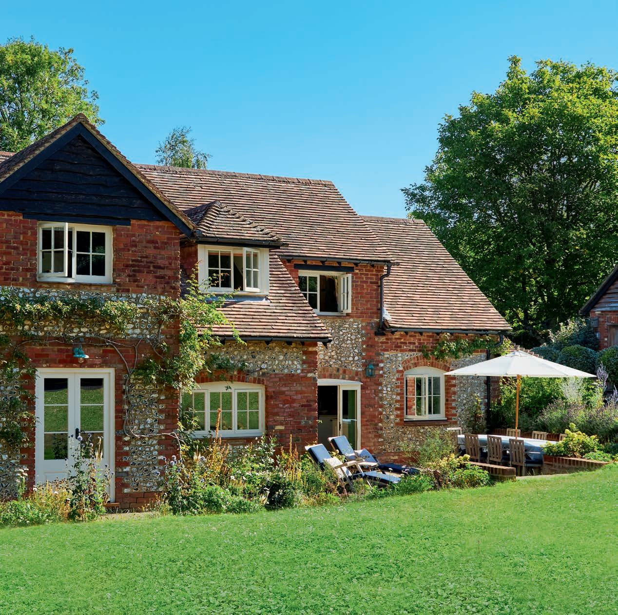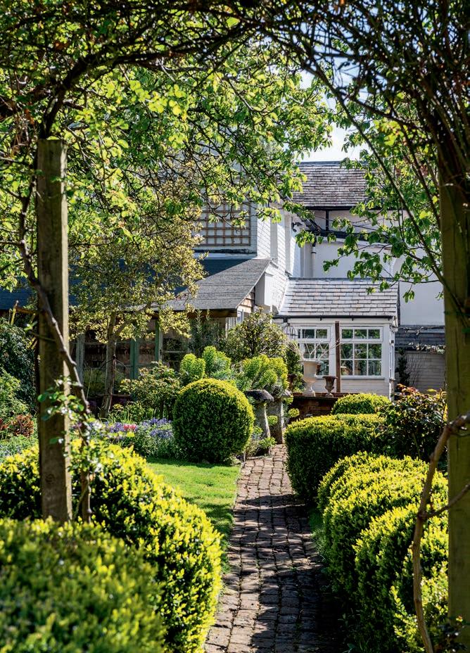 OPPOSITE Climbing roses trained into an arch frame the view of the house from the garden at the rear.