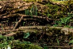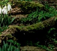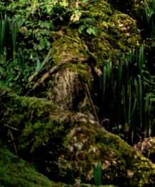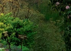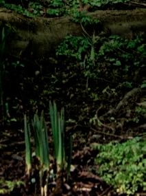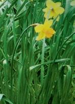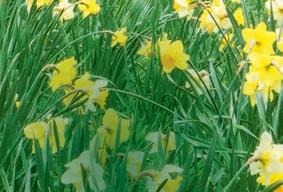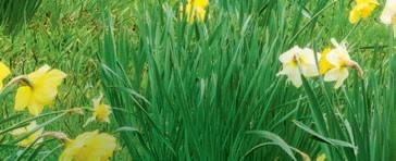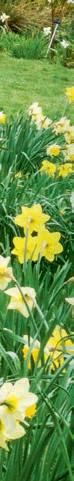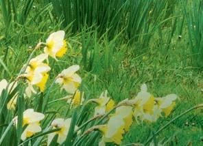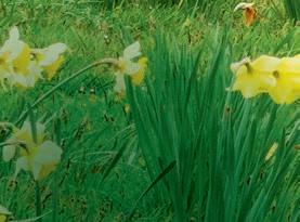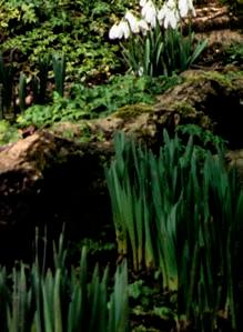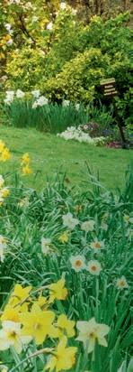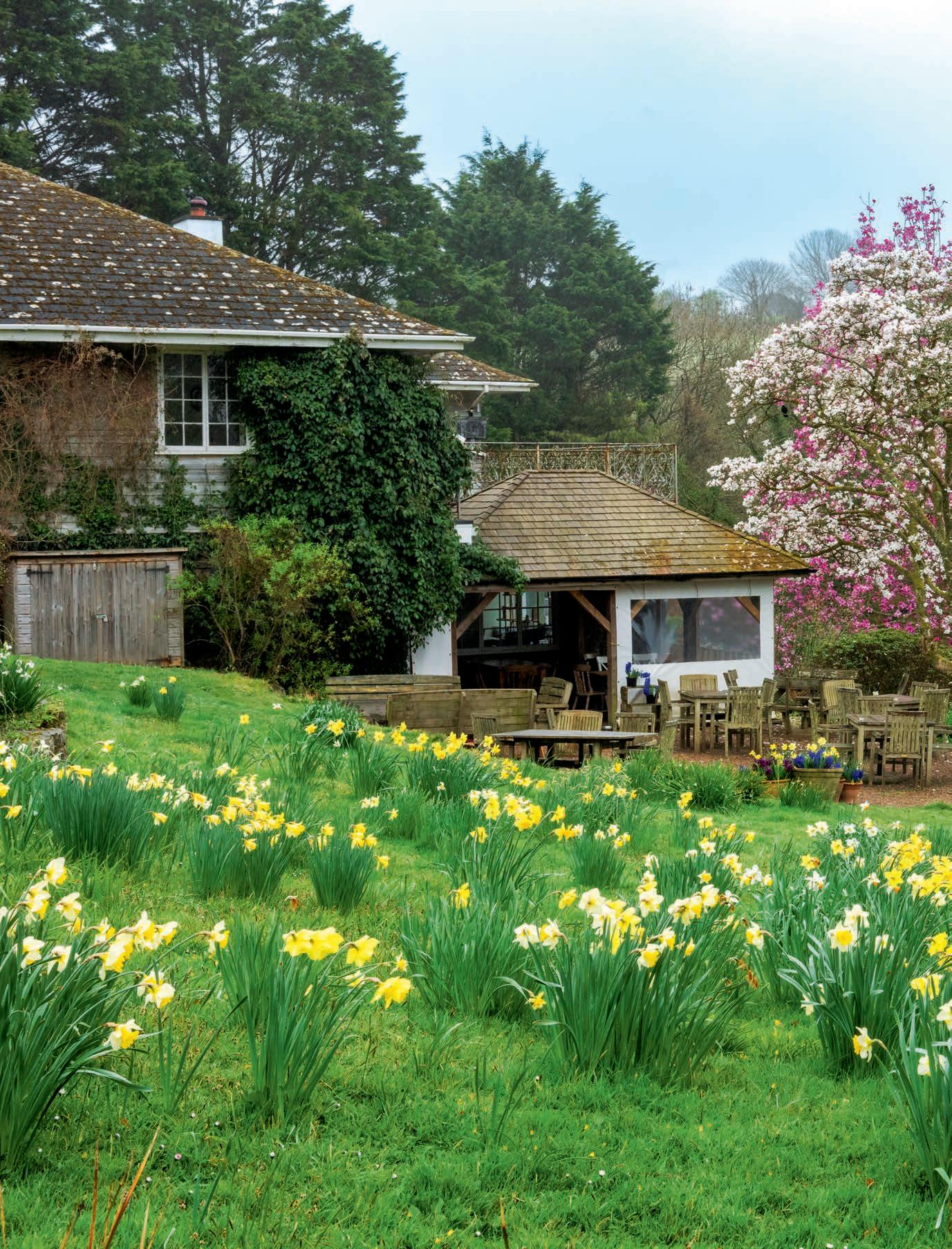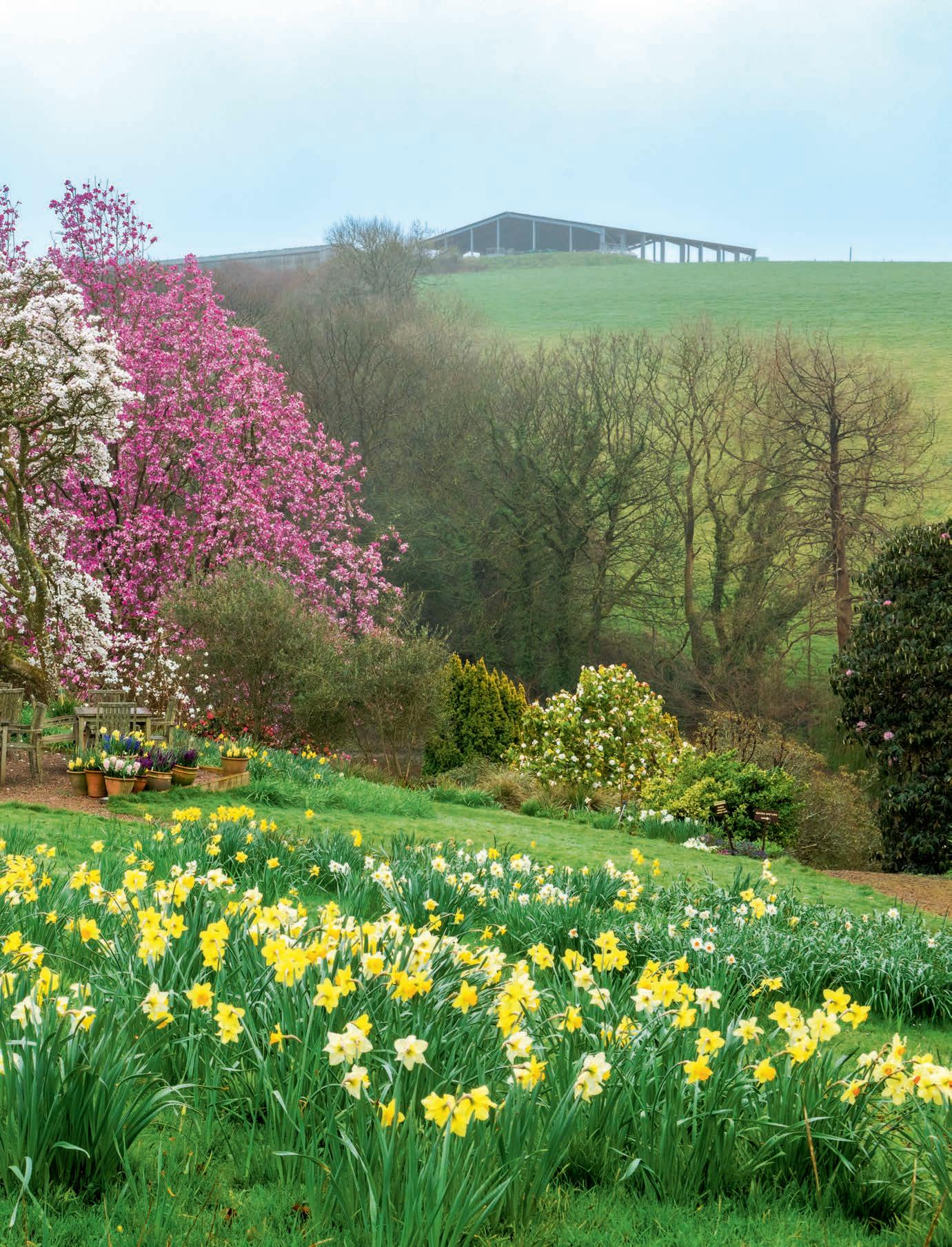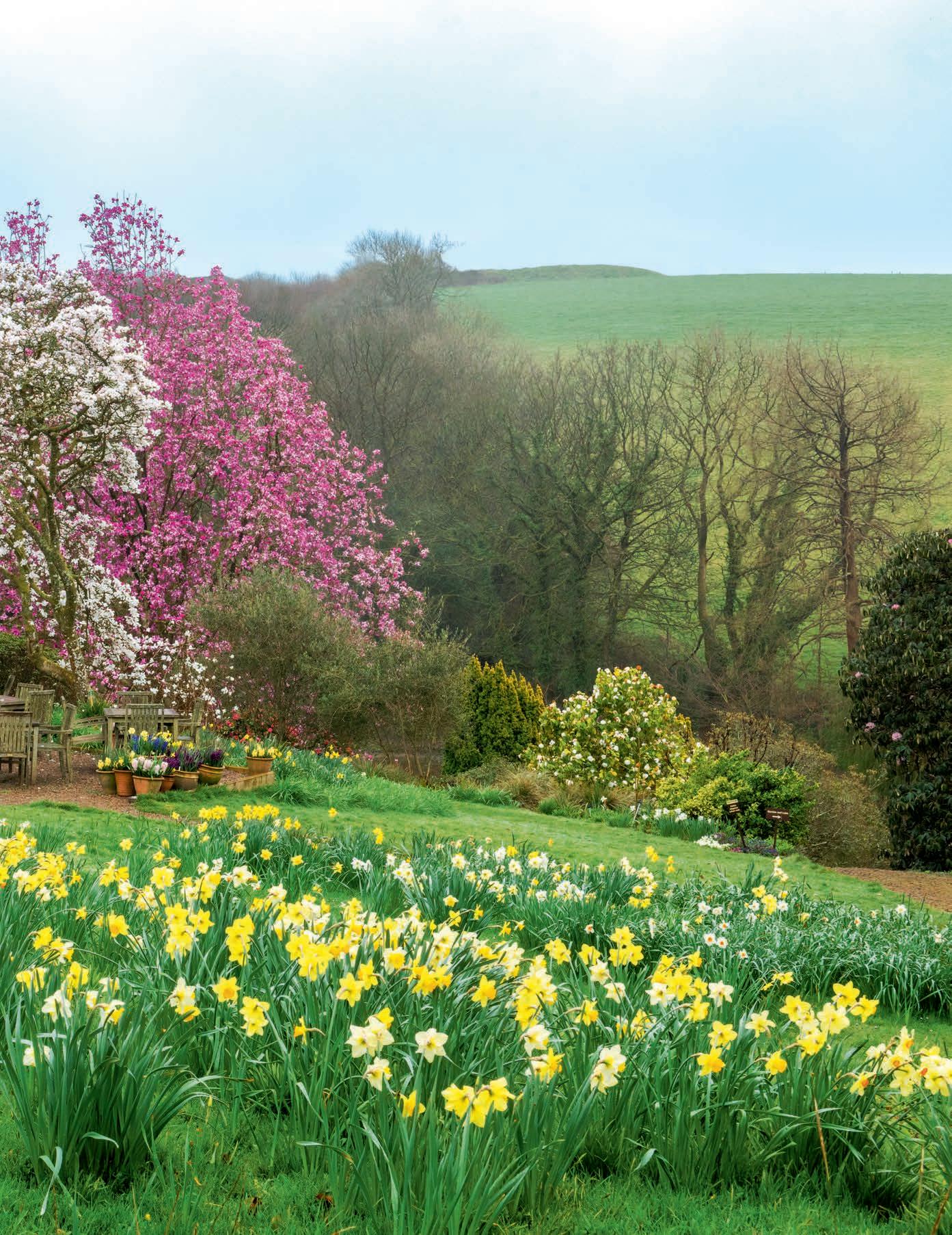 Beyond a patchwork of daffodils, pale pink Magnolia x loebneri ‘Merrill’ and darker M. sprengeri var. diva ‘Marwood Spring’.