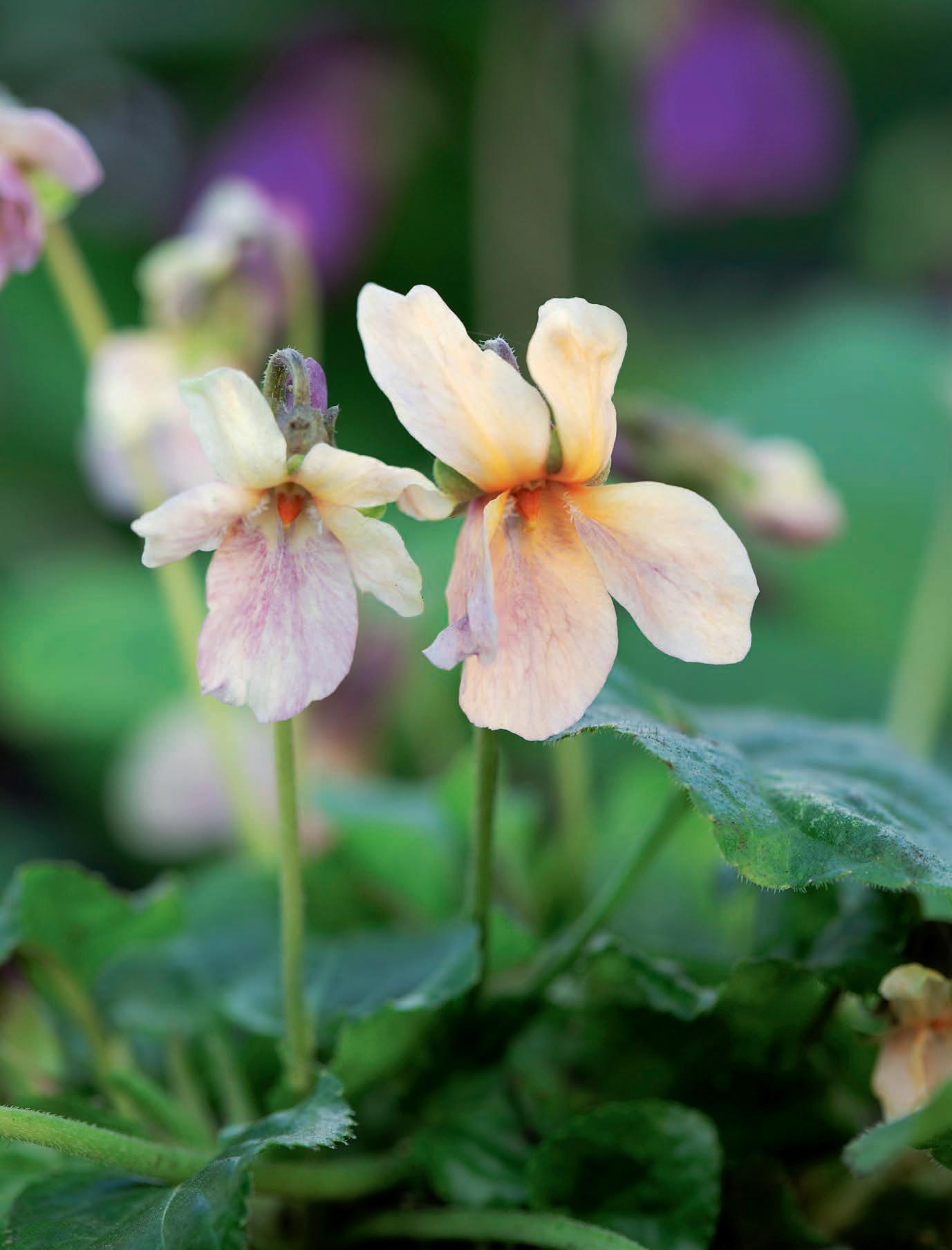 Highly fragrant Viola ‘Crepuscule’ is unusual for its apricot-yellow flowers, the lower petals often faintly su used with mauve.