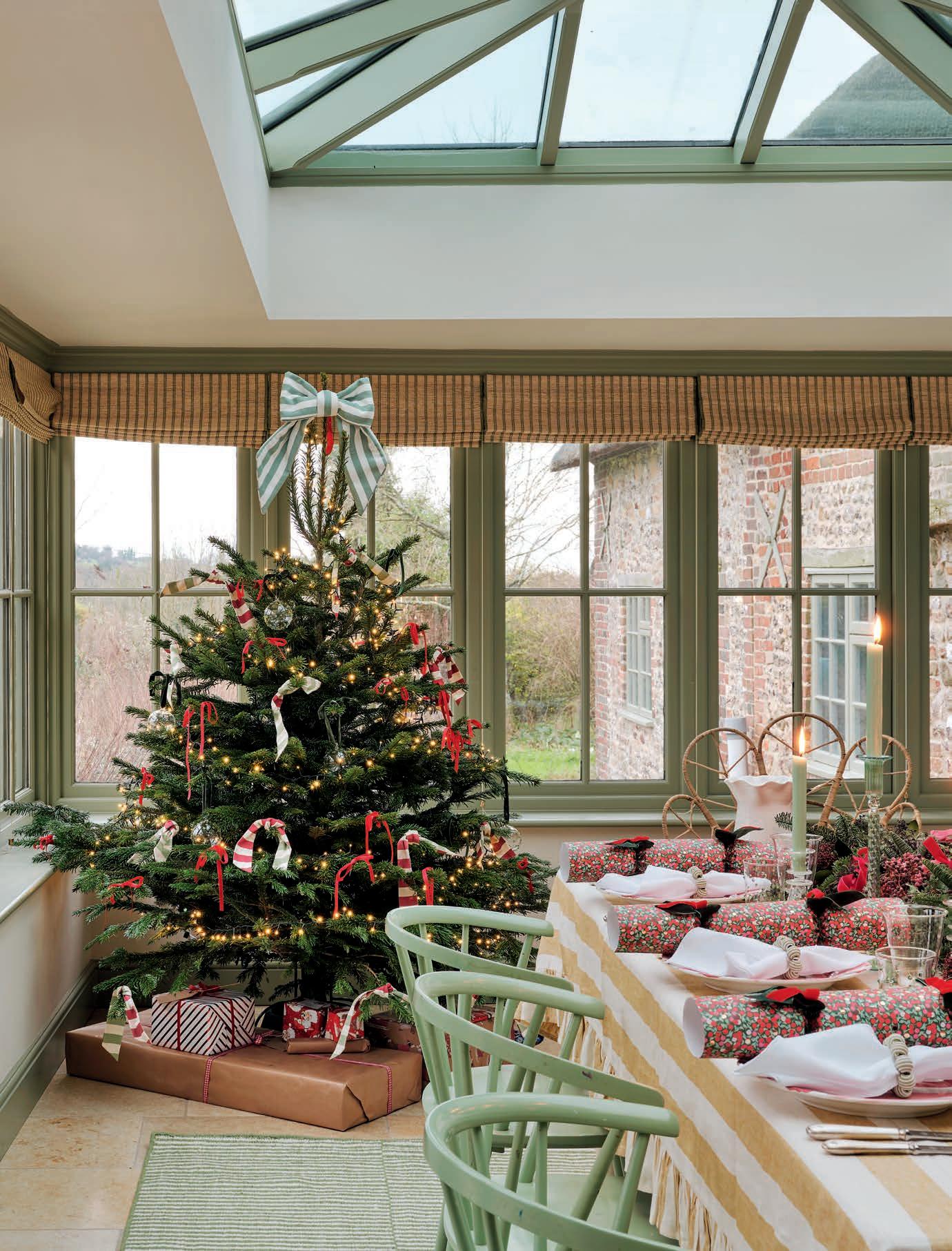 Christmas feasts are served in the conservatory at an elegantly laid table. Atop a tablecloth from Projektityyny sit a botanical centrepiece, Red Winter Berries crackers from Nancy & Betty Studio, and Green Pom glassware from Issy Granger. The dining chairs are from Graham and Green and the Striped Panel rug is by Birdie Fortescue. Sunshades from Tatiana Tafur line the windows.