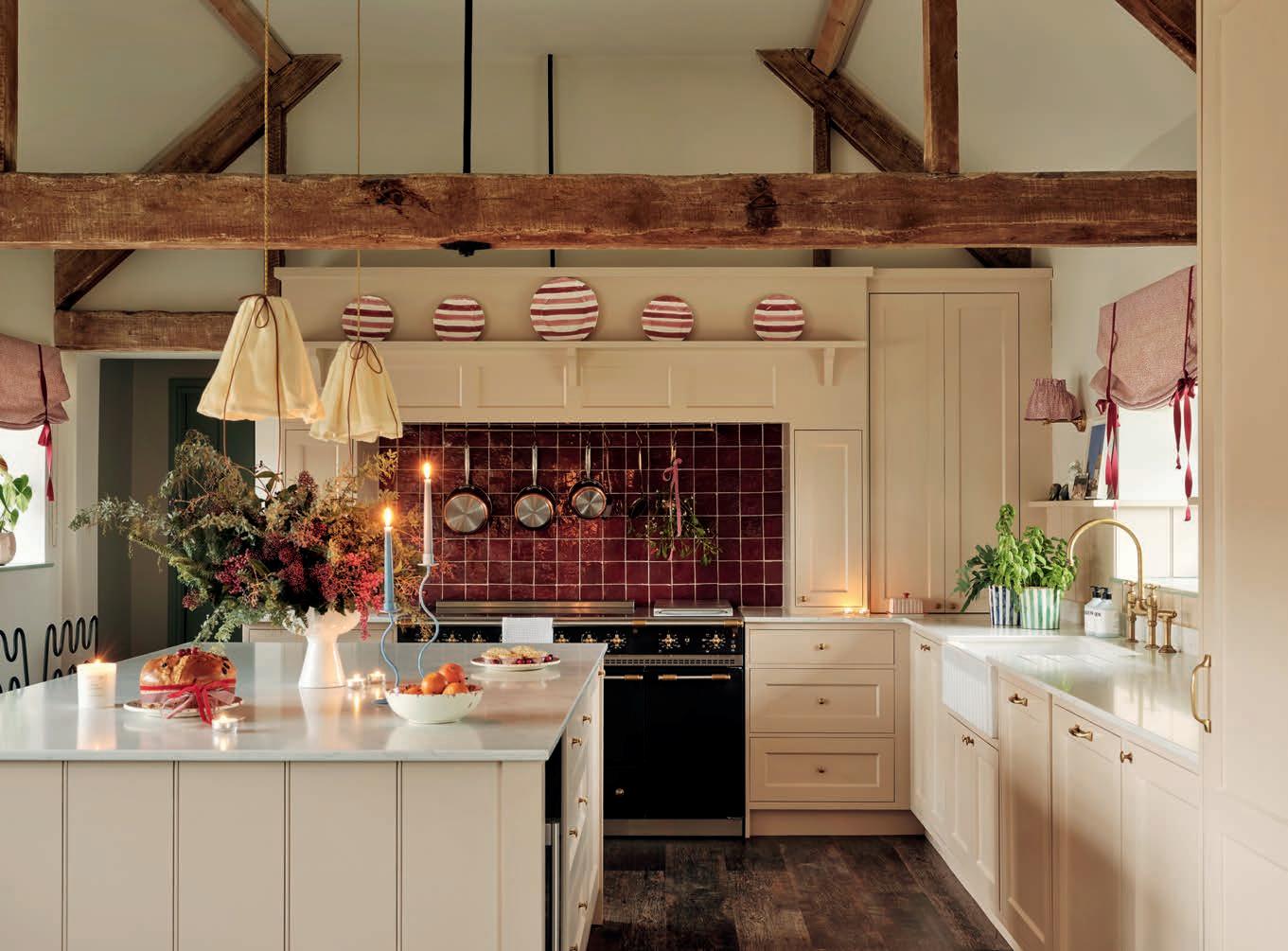 ABOVE Cabinetry by Dorset Kitchens has been painted in Farrow & Ball’s Setting Plaster. Paper Bag Bell pendants by Beata Heuman and relaxed blinds in Soane Britain fabric tied with Samuel & Son grosgrain ribbon add softness.