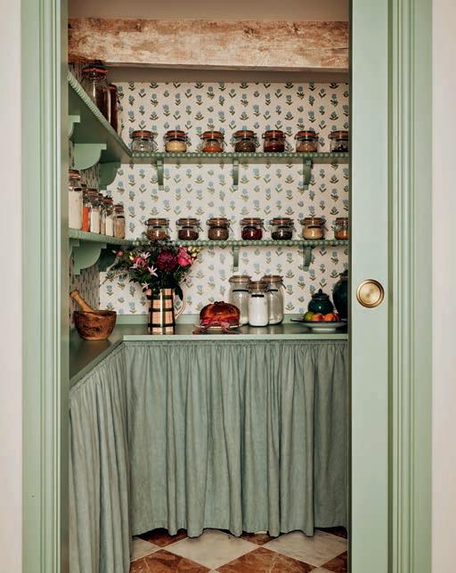 LEFT The pantry features Ottoline’s Little Wild Tulips wallpaper and Mandarin Stone floor tiles.