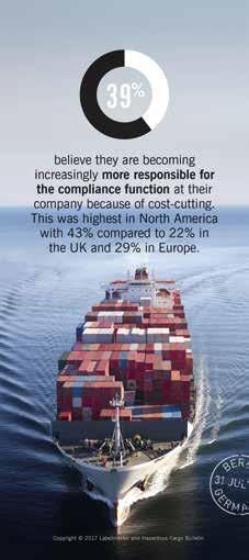 • Resource reallocation: As companies look to cut costs and gain resource efficiency, many seem to identify DG compliance as one area where roles can be combined in order to save money. In fact, 39 per cent of survey respondents believed their increased compliance responsibility is due to cost-cutting measures. Additionally, 56 per cent have or expect the role of DG compliance to be combined with other roles within their organisation.