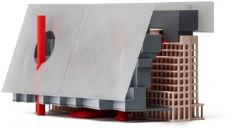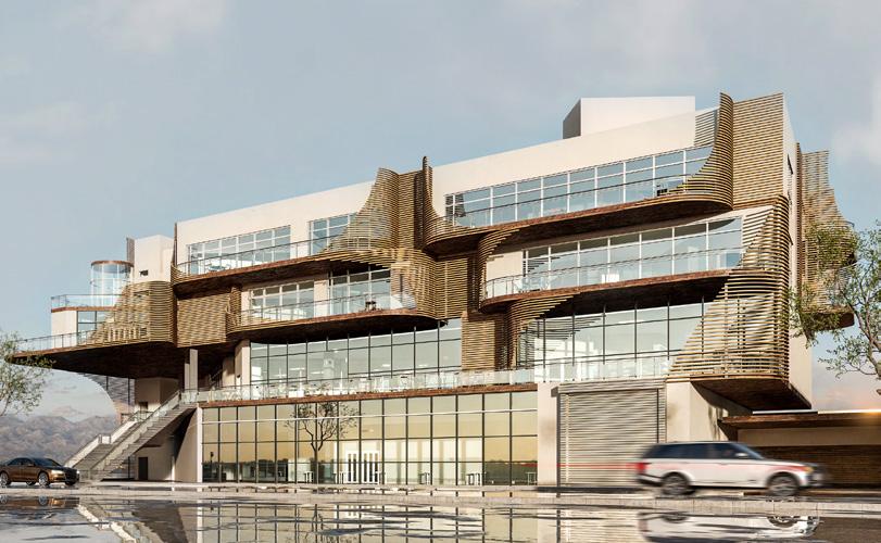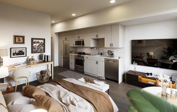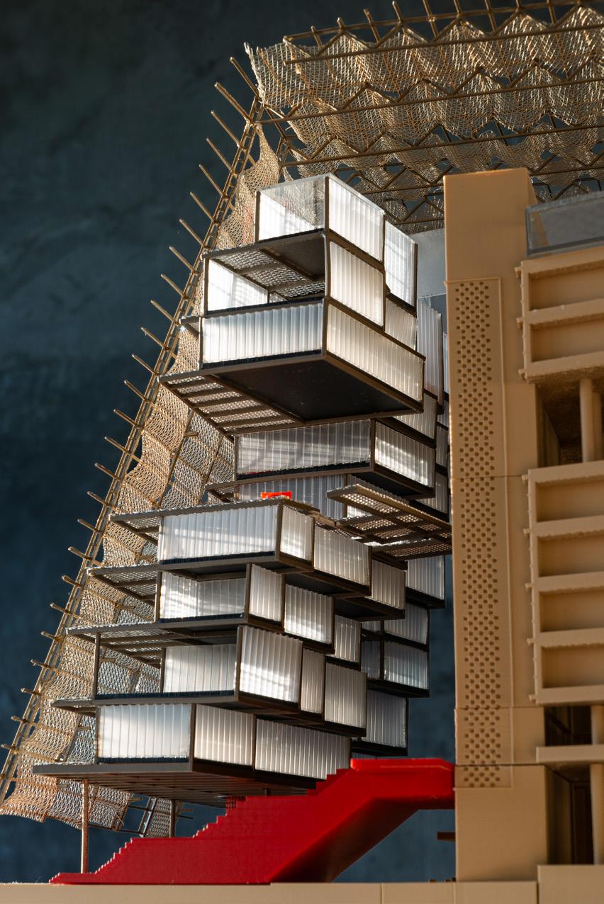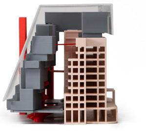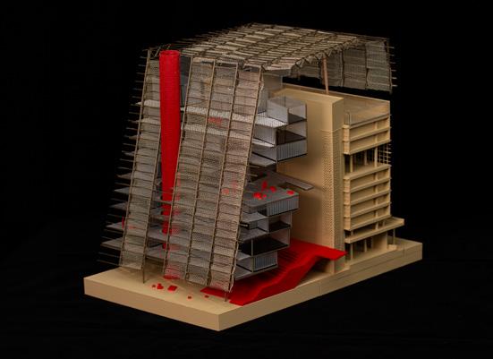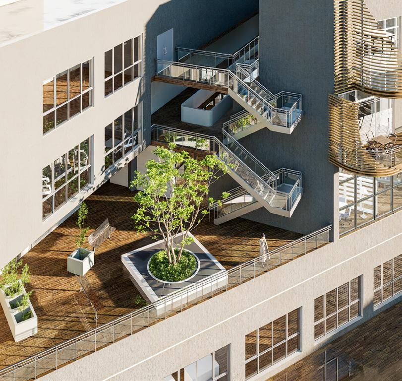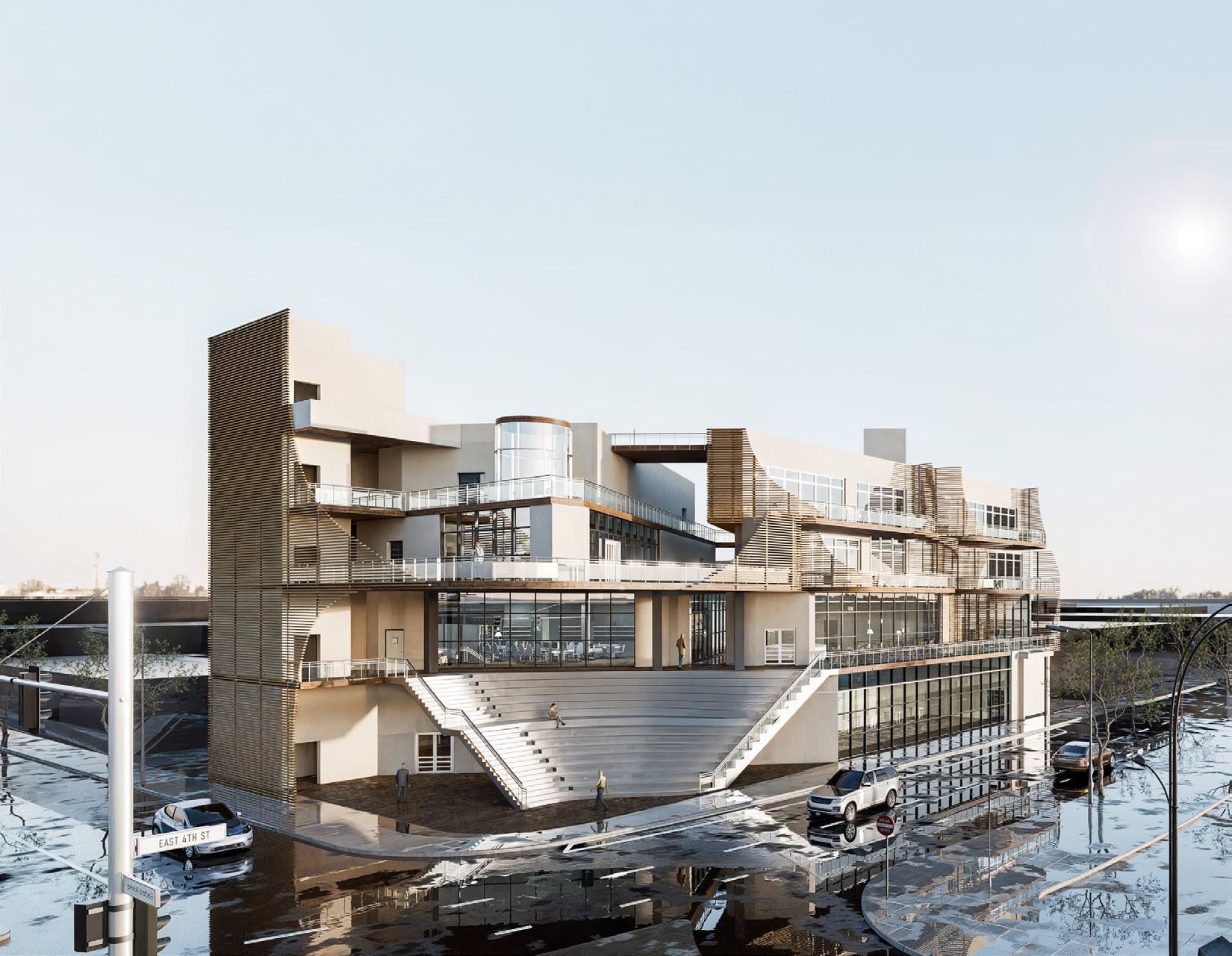 Situated in Los Angeles’s Arts District, this mixed-use project combines gallery space, artist studios, a café, and housing within a building that balances public activity and private living. A streetfacing gallery brings art to the sidewalk, while a large exterior stair at the corner creates a shared gathering space and draws visitors to the courtyard, studios, and café above. Terraces and balconies extend