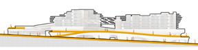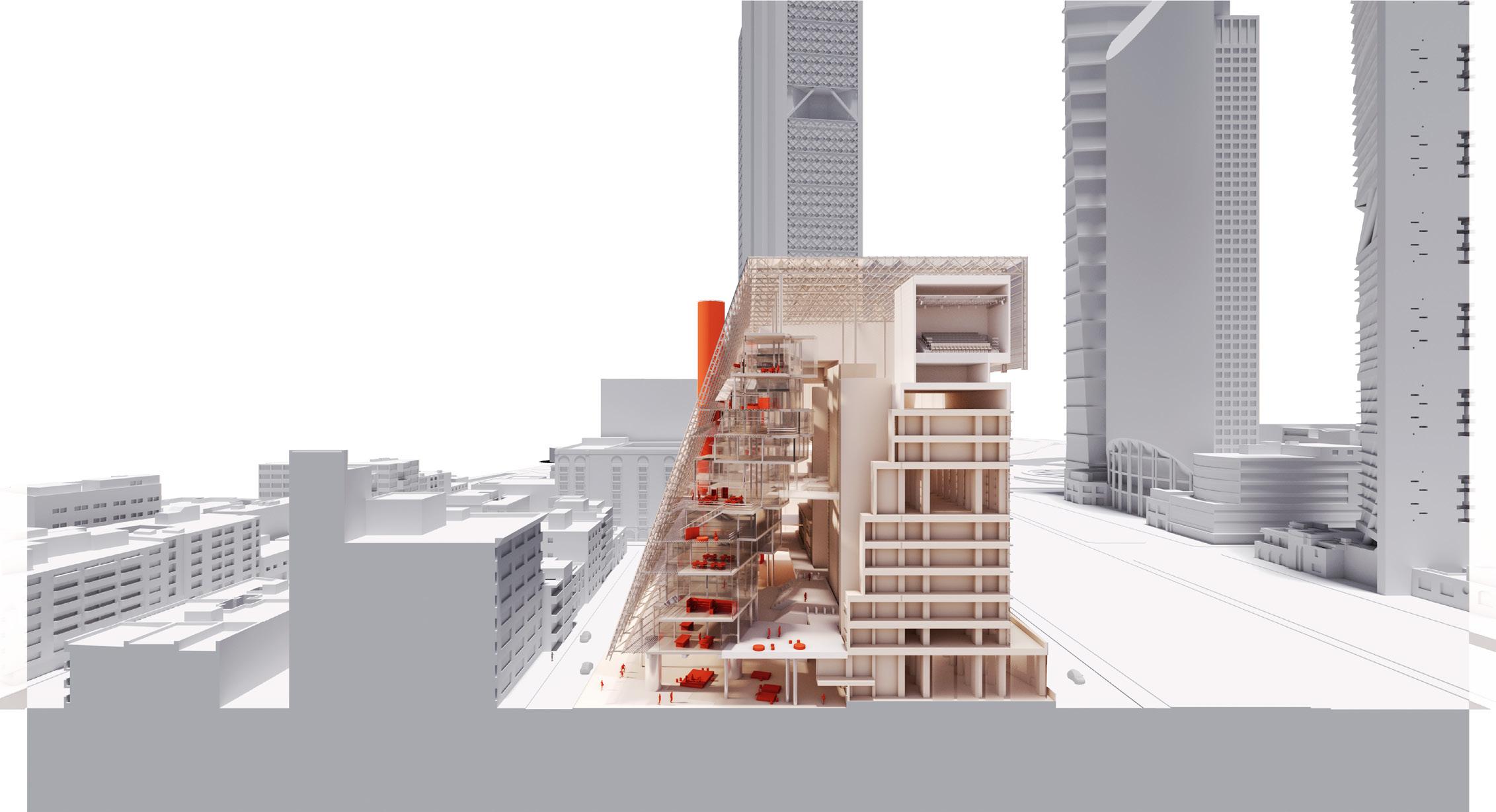 At ground level, the Public Plaza opens the project to the city, while the second floor becomes the building’s new ground floor, housing an open gallery and café.