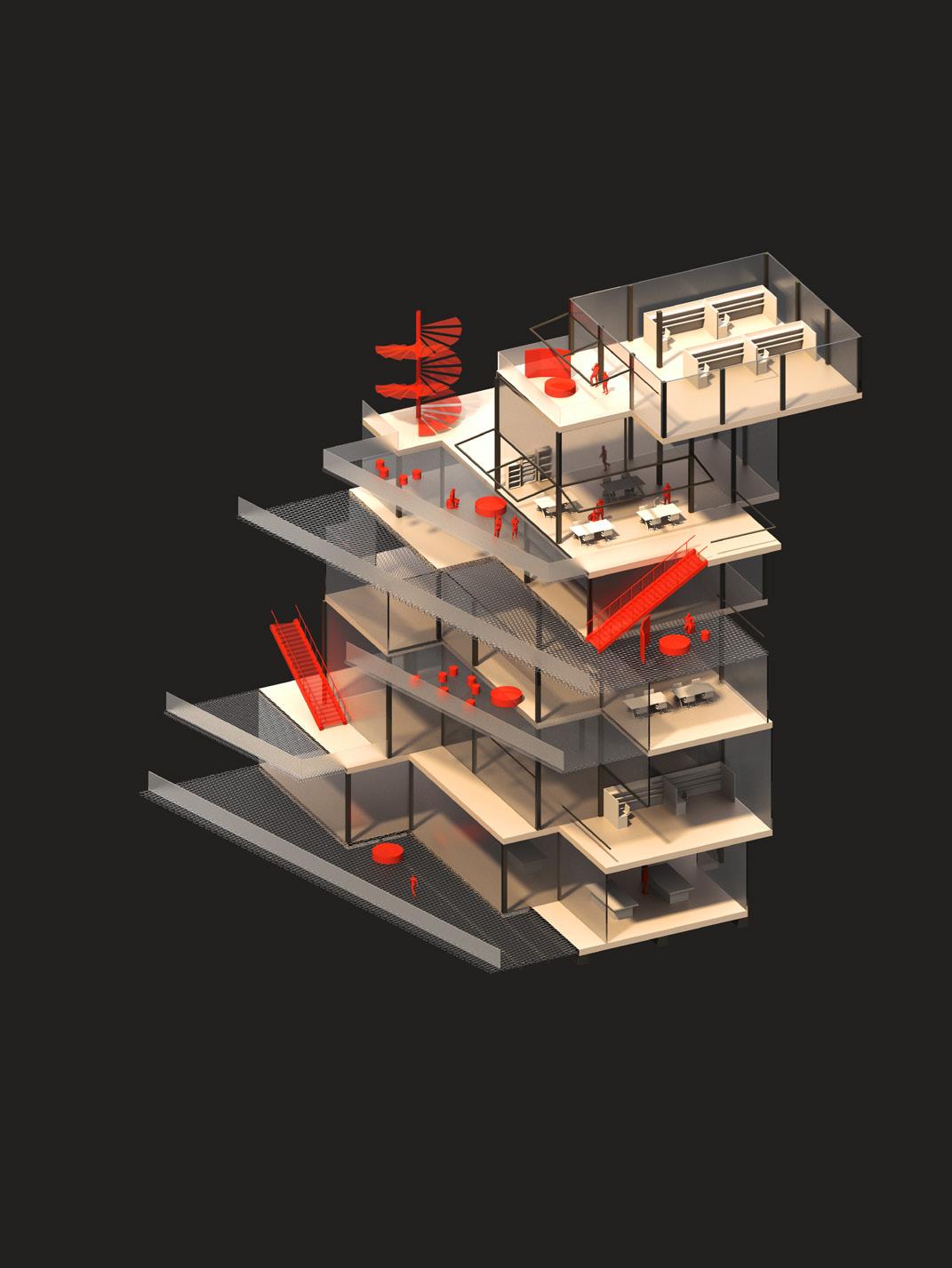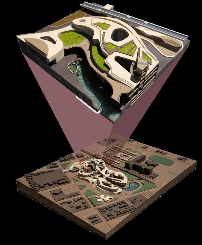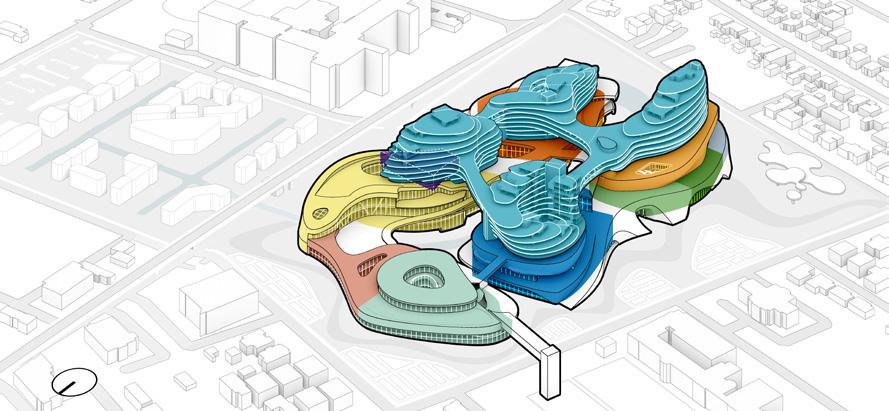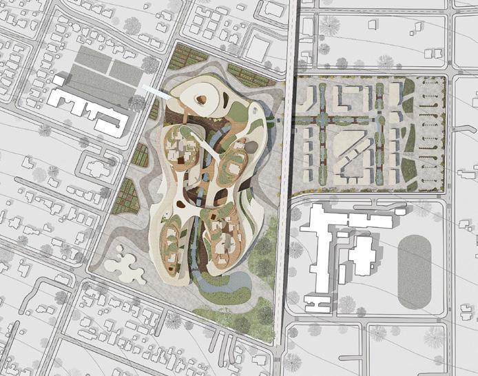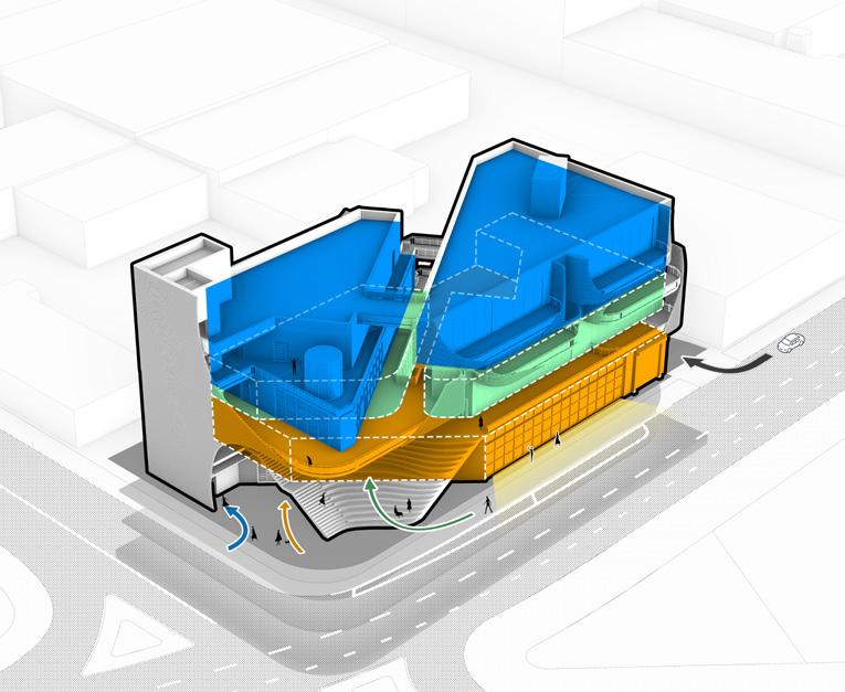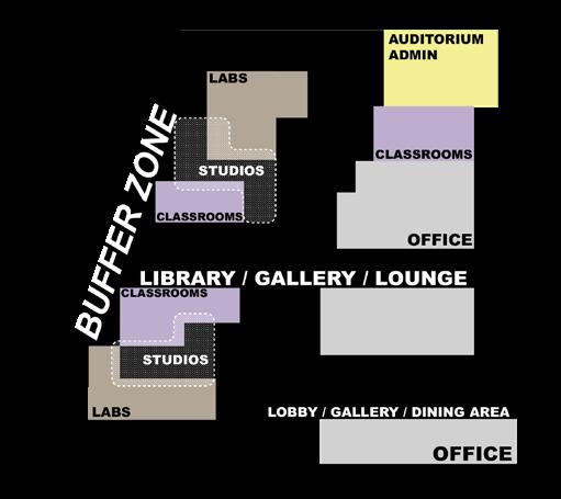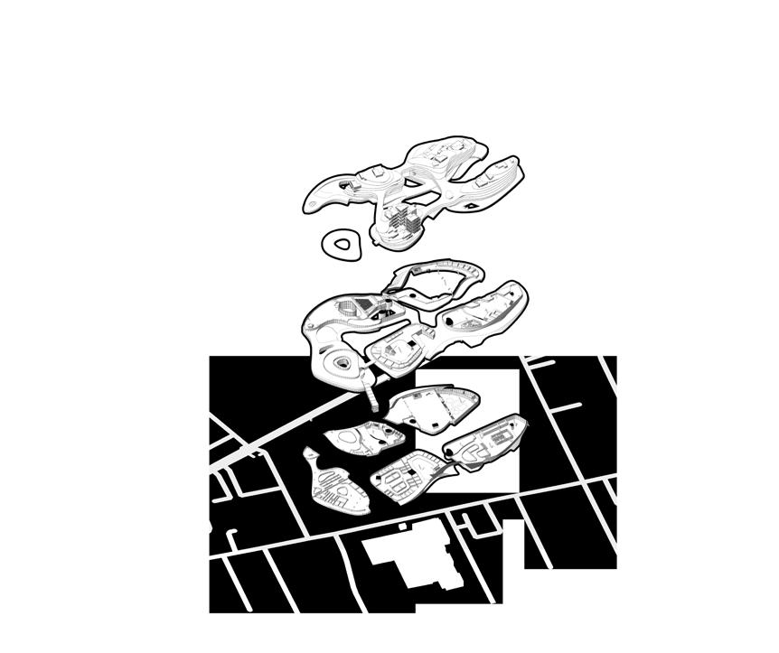 urban life. Inspired by street vendors as a decentralized model of exchange, the project introduces clustered program organization and a series of buffer spaces to encourage informal interaction, openness, and knowledge sharing. Educational programs are arranged in clusters, allowing parts of each cluster to open onto semi-public spaces and making sharing an active and essential part of the learning environment.