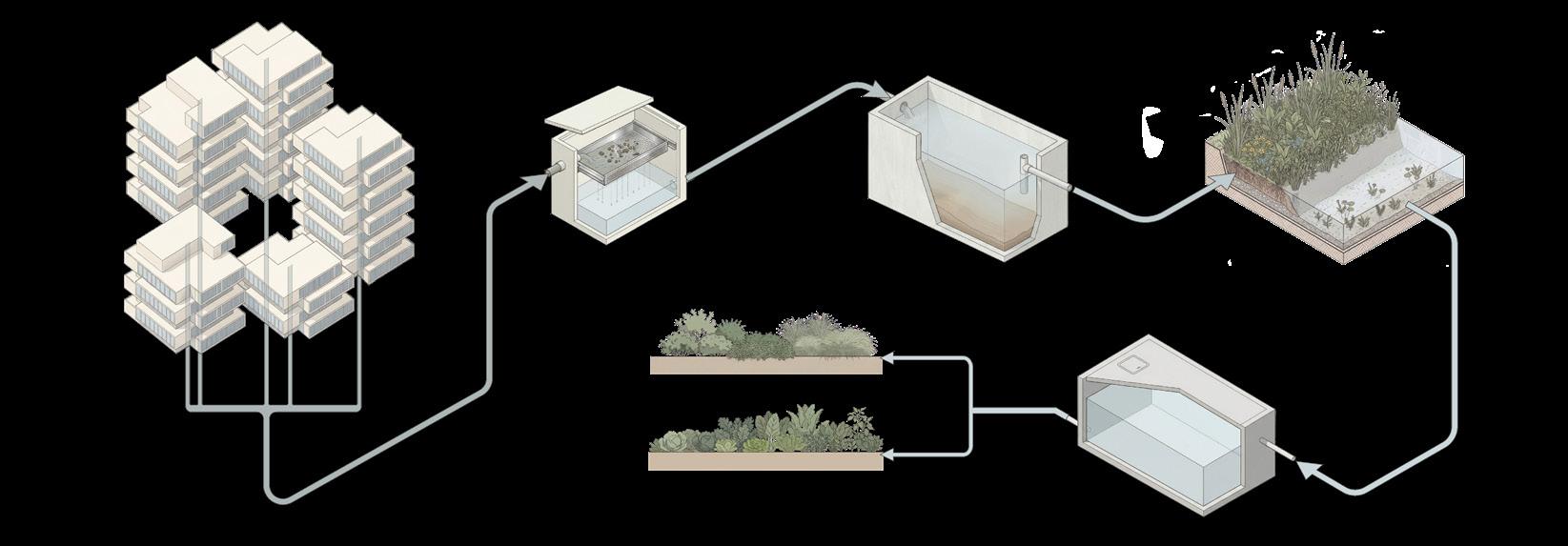 Treated greywater is reused in an ecological river landscape for filtration, habitat, and recreation.