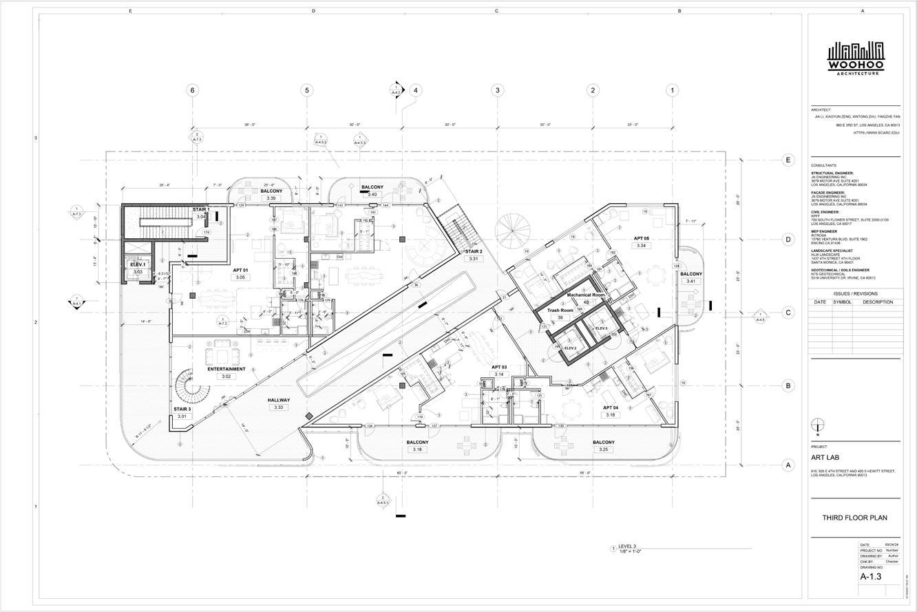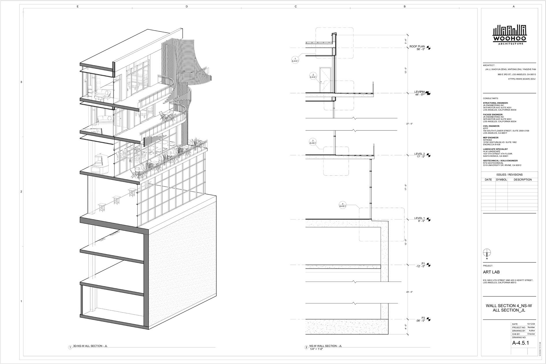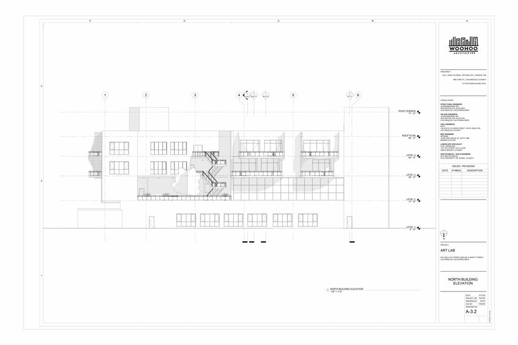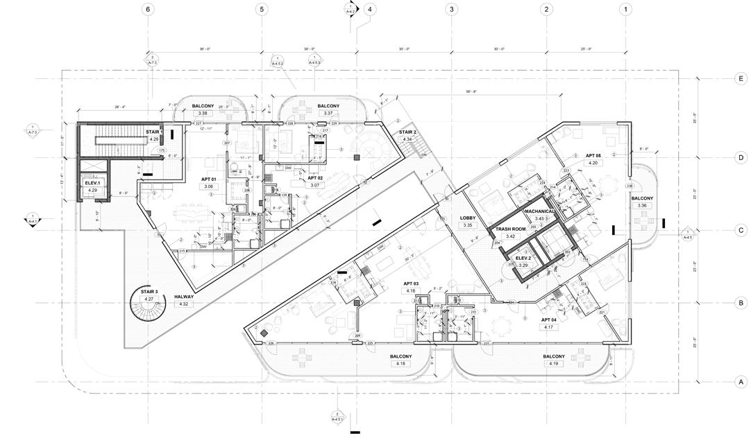 the residential levels outward, giving them privacy while keeping them connected to the street and district. Developed collaboratively in Autodesk Revit through BIM 360 , the project was carried through a full construction documentation process. The result was a comprehensive, coordinated drawing set that tested how the design could be resolved, detailed, and documented.