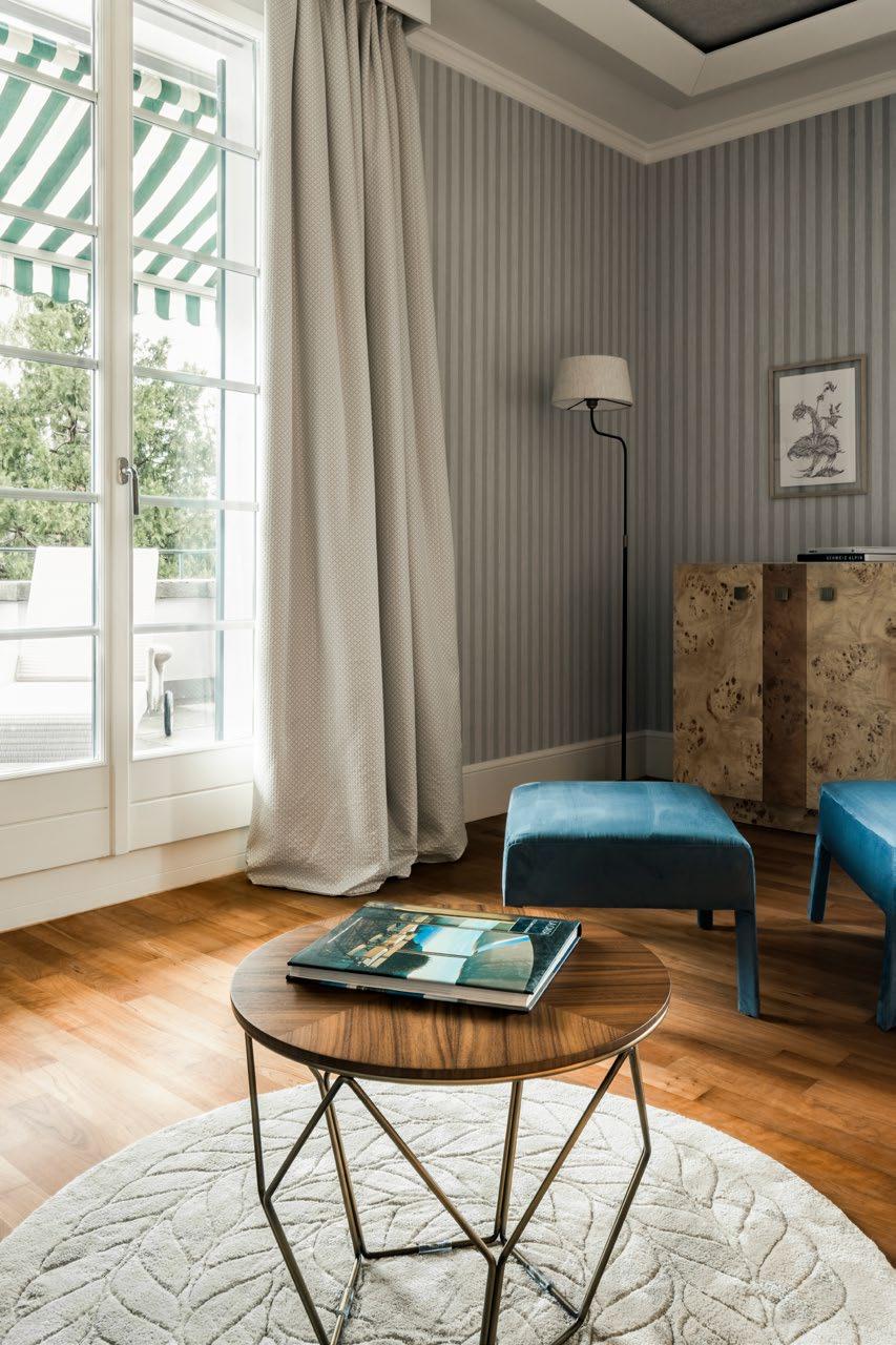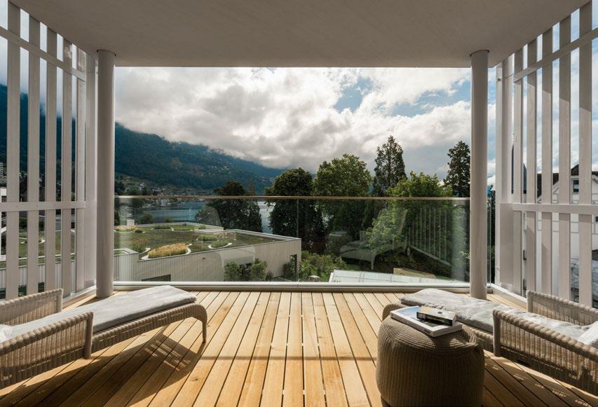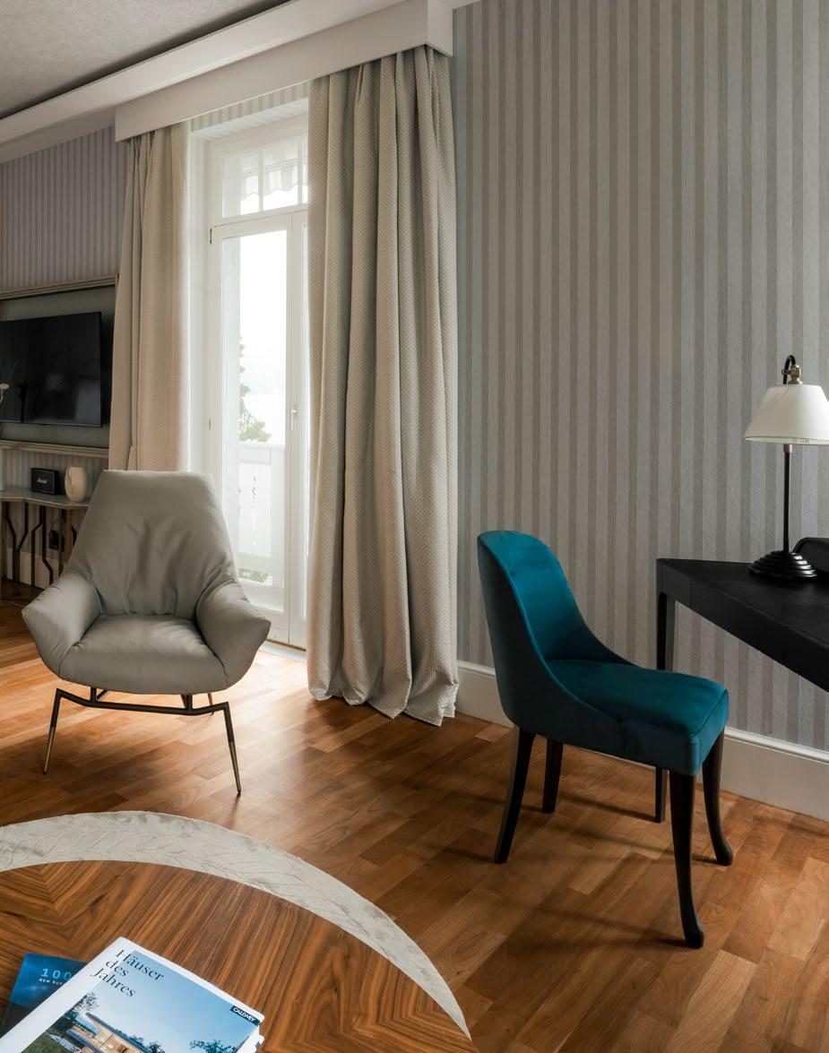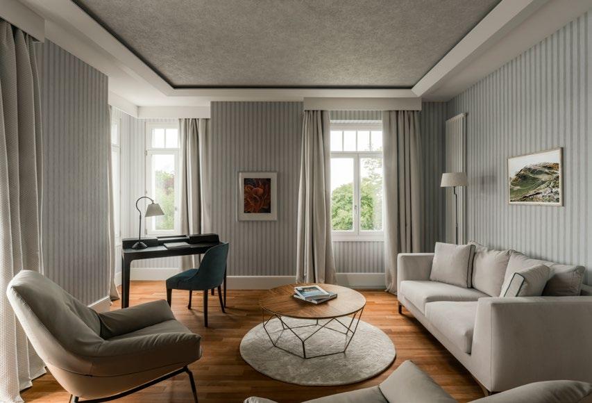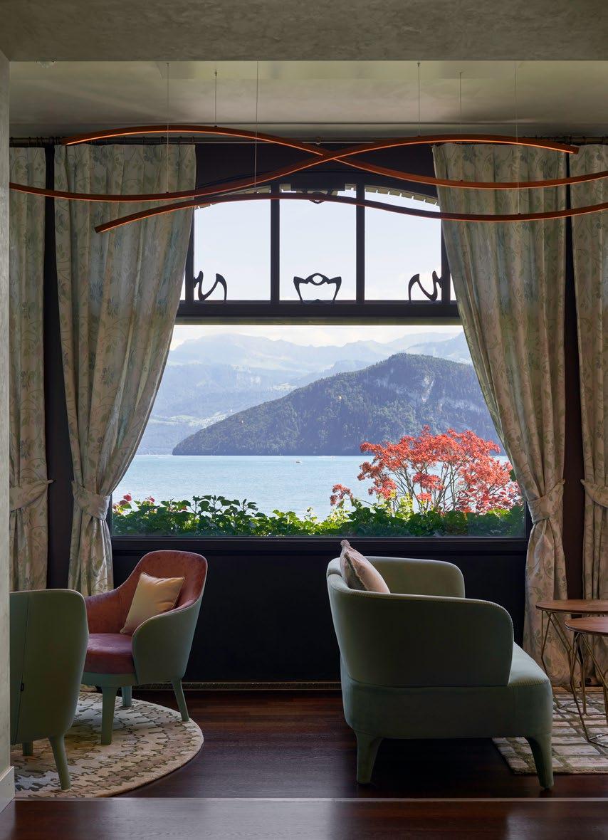 The luxuriant, contemporary chic ambiance, richly decorated with plush sofas and armchairs, beautifully crafted decorative objects, is an invitation to relax, to engage conversation, or simply muse on life in an elegantly eclectic design while appreciating the stun ning, ever-changing view of Lake Lucerne.
