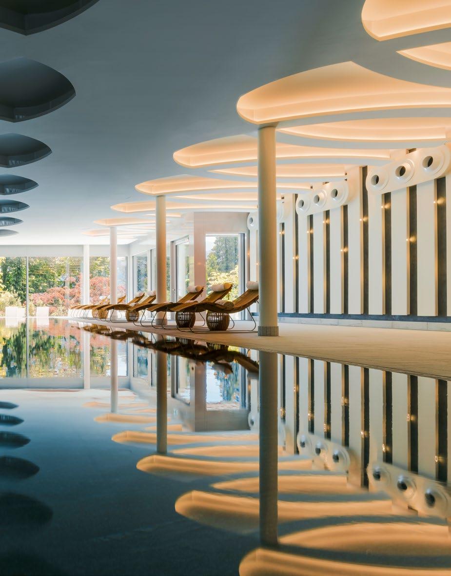 Chenot Palace Weggis spans 20,000 square metres and follows the design concept which is aimed to harmonise the ancient with the contemporary. Natural and locally sourced materials were used for the new building and its modern aesthetics, while traditional Swiss building techniques were implemented to preserve the heritage and character of the original building. The hand carved ceilings throughout the spa and communal areas have been carefully designed, evoking scenes of forests, roots, water and fire, making guests feel part of a sculpture while emulating the Chenot philosophy of vitality. The changing natural light enhances guests’ transformational journey by encouraging a body and mind balance, and this combined with the soft colour scheme ensures every angle of the palace reflects an ambiance of life and energy.