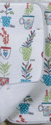 5 Grows LOVE © Nicole Tamarin HERE R7516 Love Grows $3.75 min 6 F. DUAL PURPOSE TERRY TOWELS 16 in x 26 in, 100% cotton. flat weave face with terry cloth backside. R7510 Bouquet $3.75 min 6 R7518 Wreath $3.75 min 6 R7519 Home Sweet Home $3.75 min 6 R7517 Embr. Tea Towel $3.75 min 6 R7513 Embr. Flour Sack $3.75 min 3 R7511 Embr. Hostess Apron $12.00 min 1 R7512 Pocket Mitt $3.50 min 6 R7515 Grabber Mitt $4.00 min 3 R7514 Braided Placemat $3.50 min 12 R7509 Embr. Dual Purpose Towel $3.75 min 6 A. EMBROIDERED DUAL PURPOSE TERRY TOWEL, TEA TOWEL, & FLOUR SACK 16 in x 26 in dual purpose terry, 18 in x 28 in tea towel, 26 in x 26 in flour sack B. BRAIDED PLACEMAT 14.5 in round C. EMBROIDERED HOSTESS APRON 20 in x 30.5 in, with pocket D. EMBROIDERED POCKET MITT & GRABBER MITT 8 in pocket mitt, 5.5 in x 7.5 in grabber mitt E. 2PK SWEDISH FUN CLOTHS 6.5 in x 8 in, 70% cellulose/30% cotton R7635 2PK Fun Sponge Cloths $5.00 min 3 sets