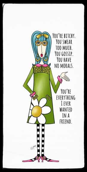 MIN: 3 | WHOLESALE $5.65 ea. MSRP $11.99 ea. FlOUR SACK TOWELS DESIGNED & PRINTED IN THE U.S.A. I Lift Spirits. DM3-018-0080 DM3-019-0079 The more people I meet, the more I like my dog. DM3-020-0078 Some People Have a Bucket List.. I Have a Pluck It List DM3-021-0077 Corks are for quitters. DM3-022-0076 Bring your wine to work day. DM3-023-0075 Friends are like thighs.... Always sticking together. DM3-024-0074 From a procrastination standpoint... I’ve been wildly successful DM3-025-0073 You’re Bitchy. You Swear Too Much. You Gossip. You Have No Morals. You’re everything I ever wanted in a friend.