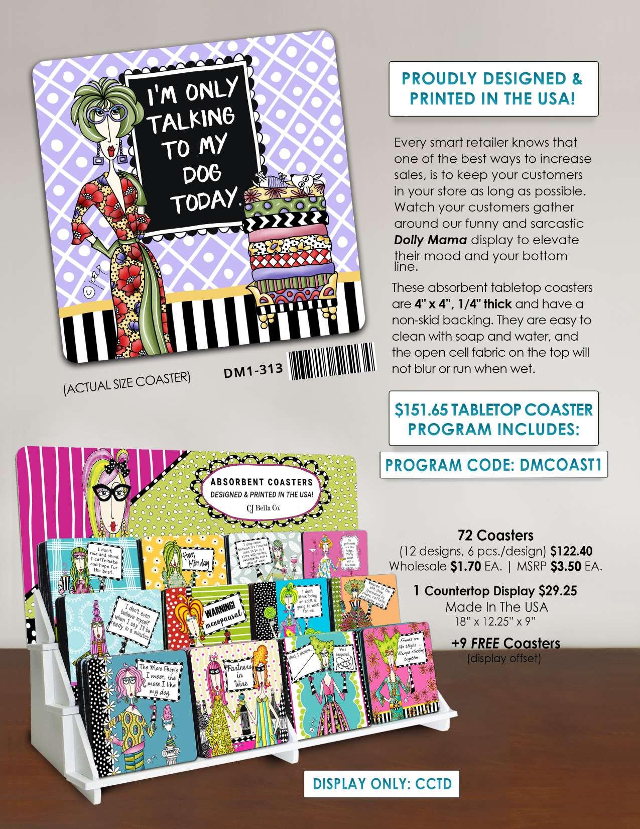 MIN: 6 | WHOLESALE $1.70 ea. MSRP $3.50 ea. TABLE TOP COASTERS DESIGNED & PRINTED IN THE U.S.A. DM1-010 I’m too sober for this shit. DM1-011 No one will ever be as entertained by us as us. DM1-012 That’s a horrible idea. What time? DM1-013 I think my guardian angel drinks. 7 22537 74103 3 DM1-020 The more people I meet, the more I like my dog. 7 22537 74102 6 DM1-021 Some People Have a BucketList.. I Have a Pluck It List 7 22537 74105 7 DM1-018 I Lift Spirits. 7 22537 74104 0 DM1-019 You’re Bitchy. You Swear Too Much. You Gossip. You Have No Morals. You’re everything I ever wanted in a friend. 7 22537 74107 1 DM1-016 The problem with being so open minded is, my brain keeps falling out. 7 22537 74106 4 DM1-017 HEY MONDAY 7 37214 51982 9 DM1-014 Well... Apparently rock bottom has a basement 7 37214 51981 2 DM1-015 GOLF Get out, leave family