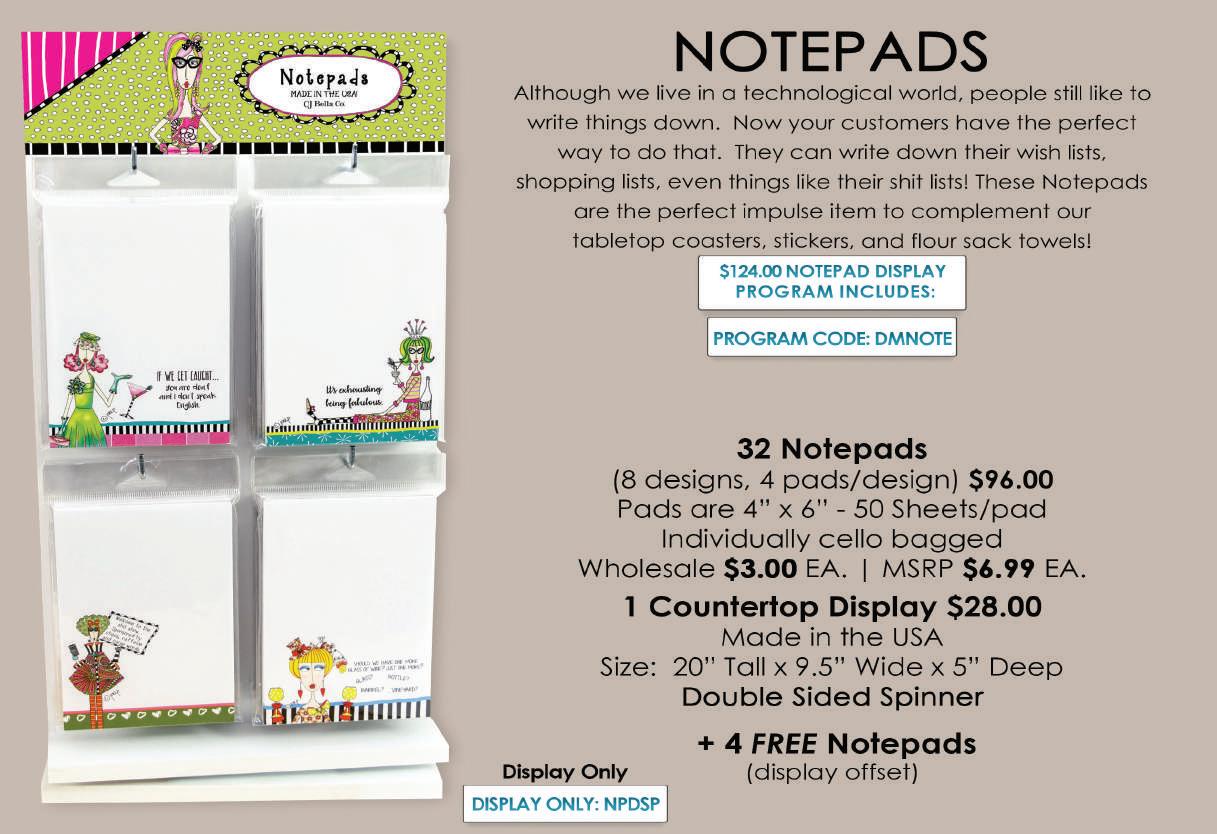 MIN: 4 | WHOLESALE $3.00 ea. MSRP $6.99 ea. NOTEPADS~50 Sheets per pad MADE IN THE U.S.A. 7 22537 74031 9 7 22537 74035 7 7 22537 74032 6 7 22537 74036 4 7 22537 74033 3 7 22537 74037 1 7 22537 74034 0 7 22537 74038 8
