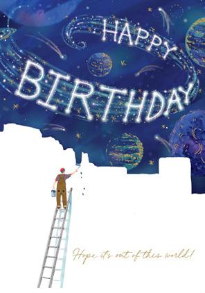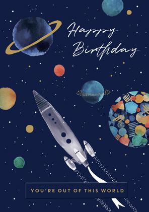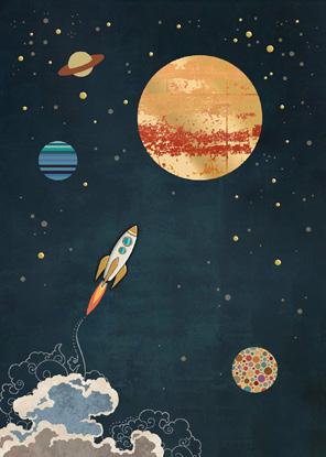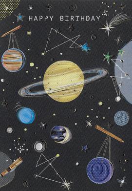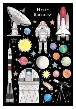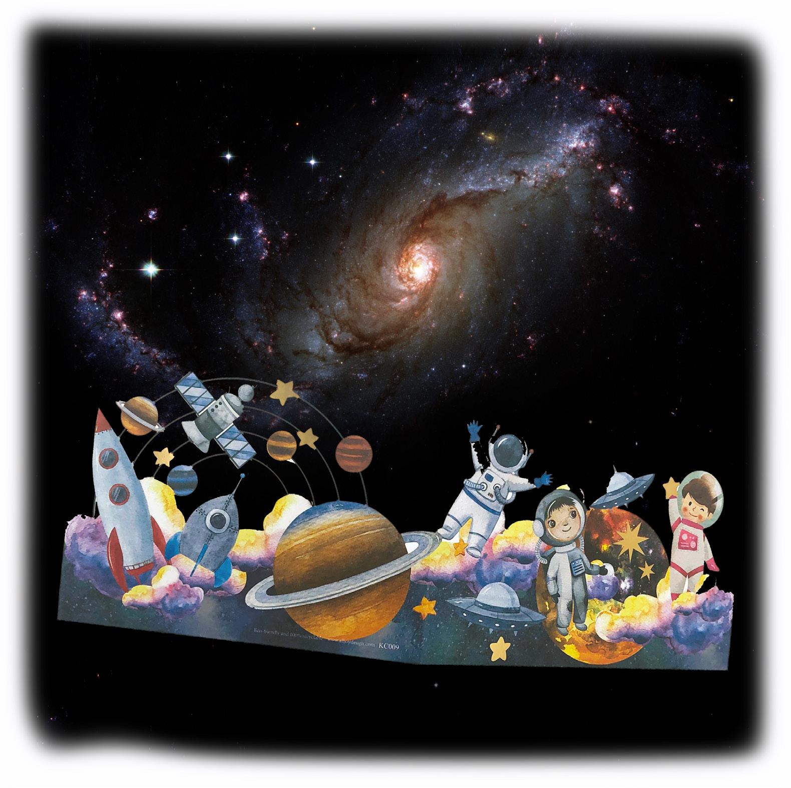 Features space-themed illustrations