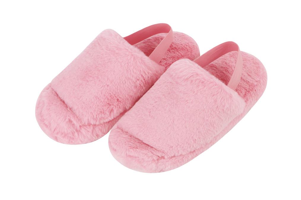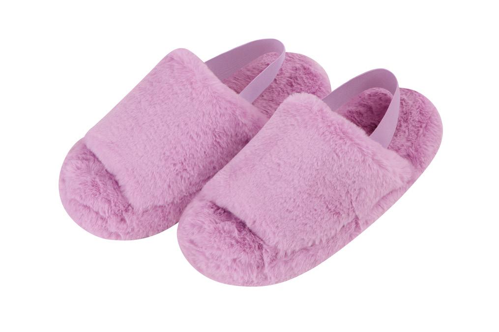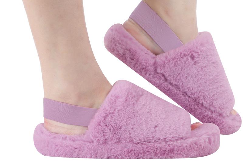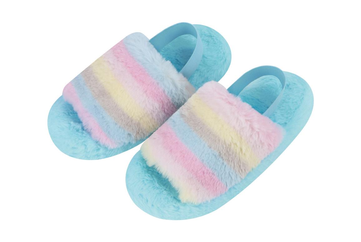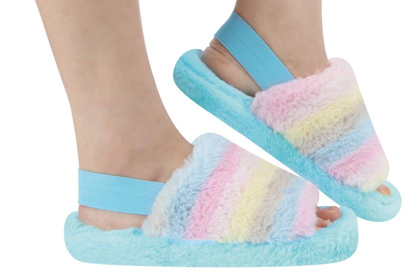 Our faux fur open toe slide snoozies!® body in spring colors with a dyed-to-match elastic band. Mixing style and comfort for the most adorable spring yet! Type