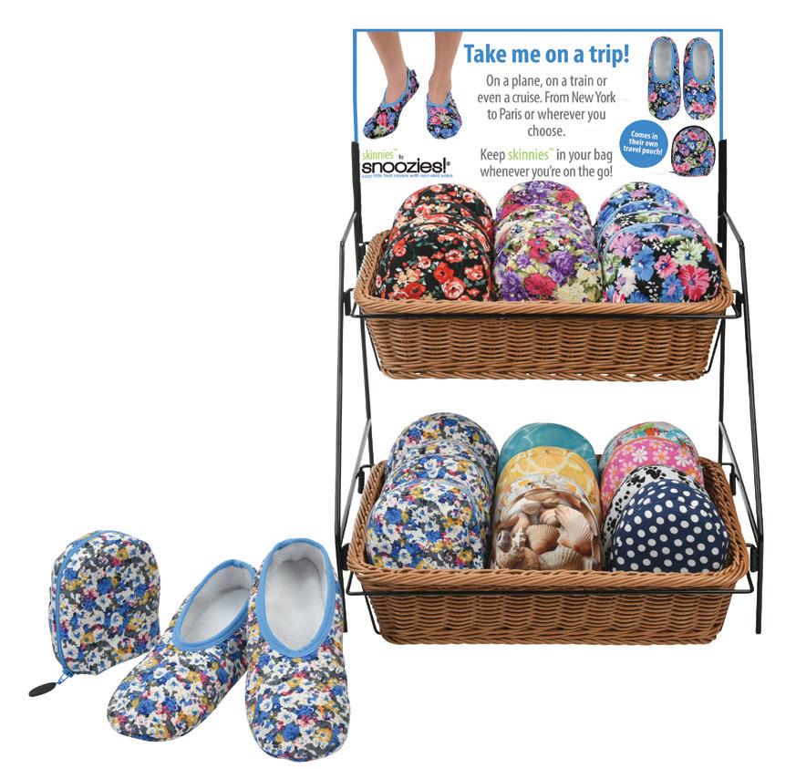 Holds up to 144 pairs of skinnies!® (6 cases) or 72 pairs of snoozies!® (2 cases). Counter spinner has 2 levels, 12 hooks per level, with each hook holding 3-6 pairs and a round black base. snoozies!® sign included with display.