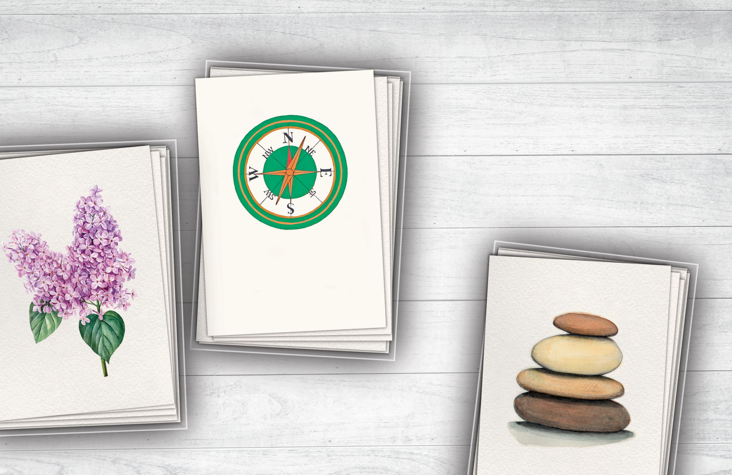 Each clear cello box contains a dozen 3.5” x 5” cards printed on creamy textured paper. Cream envelopes.