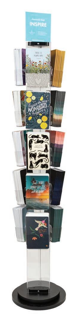 Features 48 journals—8 each of 6 preselected, best-selling designs— in a custom metal counter display, powder coated in dark espresso. Package includes a 10% discount and free display fixture.