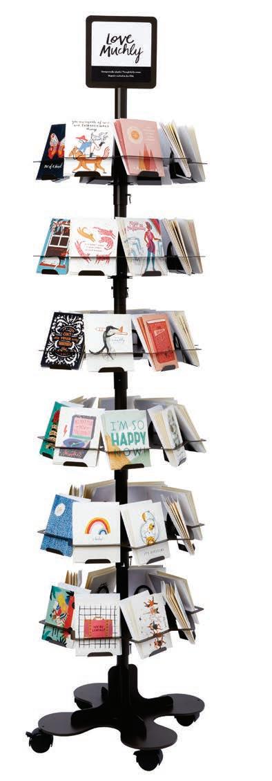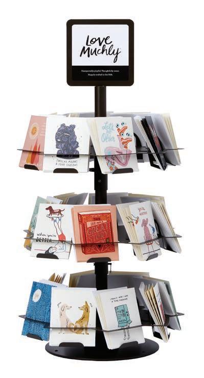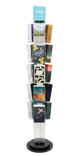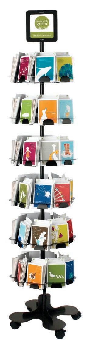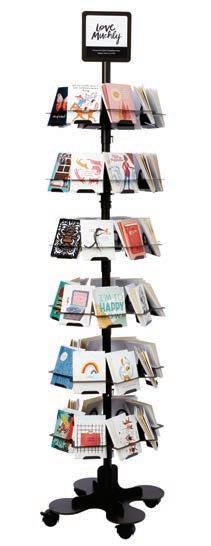 Features 576 cards with envelopes—12 each of 48 preselected designs—in an easy-to-assemble and attractive metal display. With only a 16.5” footprint, the floor display offers 6 spinning carousels and is powder coated in dark espresso to easily match any store style. Fixture comes free with package purchase.
