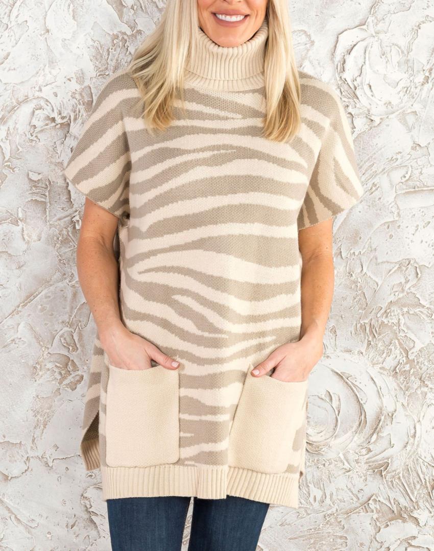 Cozy up for a night in or wear out on the town, this animal print turtleneck poncho with patch pockets is a must. This piece offers a stylish and warm winter layer that's easy to accessorize. Wear on its own or layer with a long-sleeve top for added coverage and warmth.