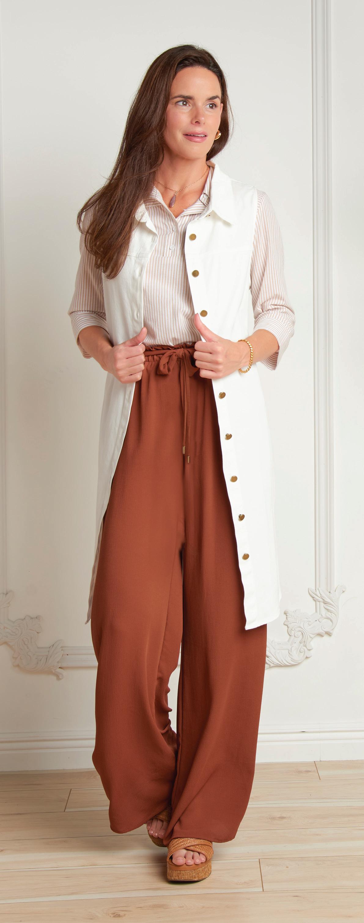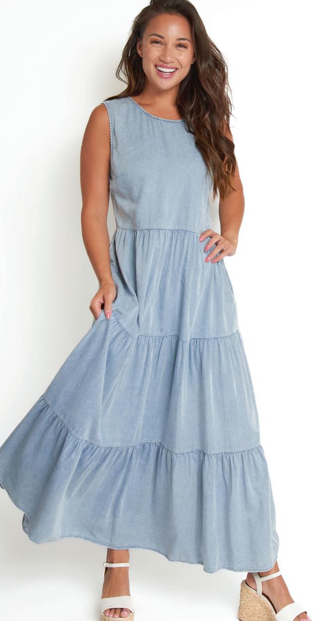Our chambray tanks, pants, & dresses are made from 100% Tencel - a natural fiber known for its silky-soft feel, breathability, and gentle drape that flatters every figure.