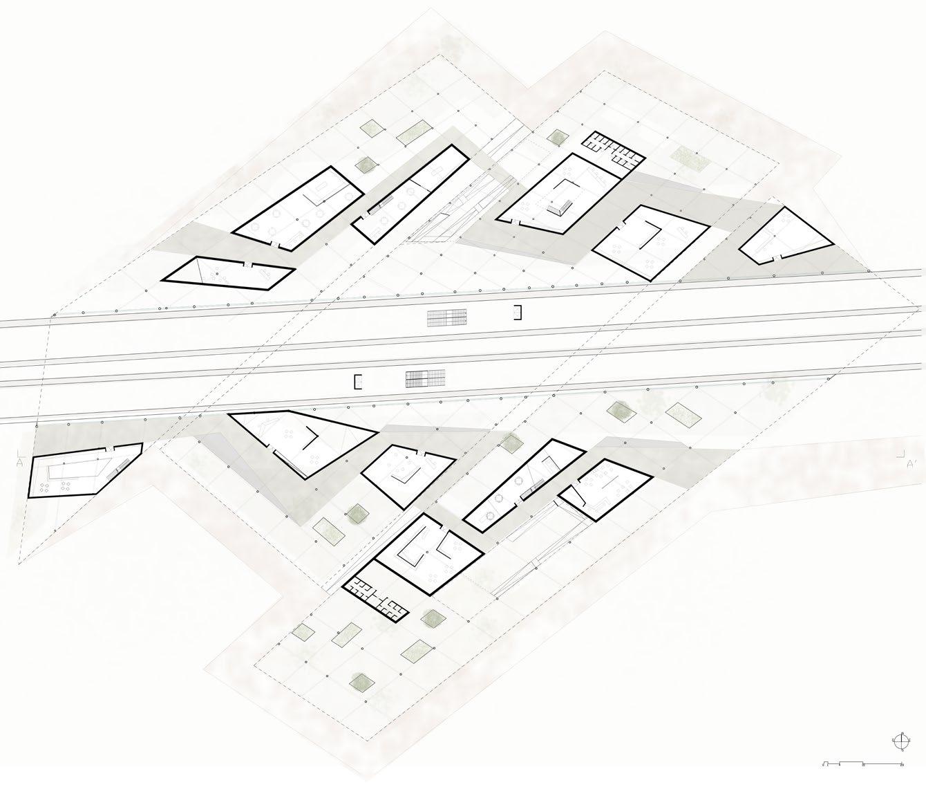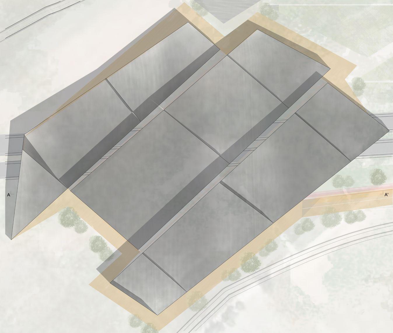structure covered in concrete, that follows the road line, while in the central part perpendicular to the main North-South axis some prefabricated cubes are inserted in the main structure.
