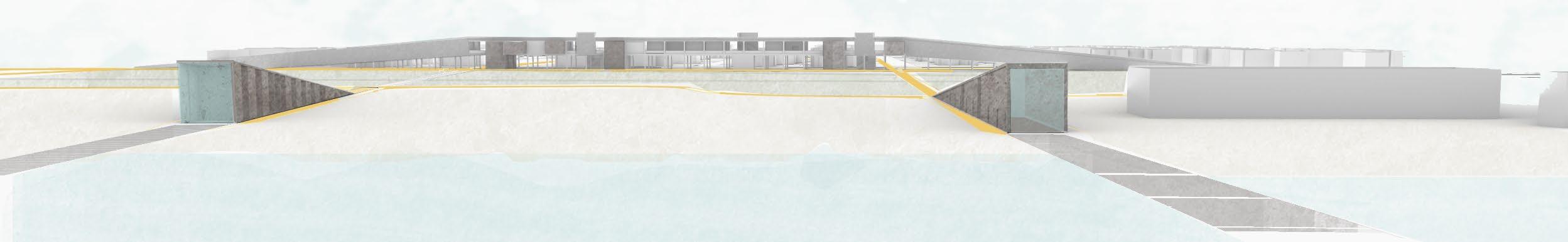 Analysing the morphological characters of the area two main elements, one natural and one artificial, have been identified: the lakes and the irregular urban fabric. The merging of these two figures provides the matrix of the project: a line that serves as a pedestrian and cycle path running along canals that, entangled with green spaces, re duce the risk of flooding in the urban area. Mov ing on, across the urban fabric and the dune, the vertical paths intersect the horizontal ones coming from the Variconi’s oasi (one of the well consol idated green areas); between the two strips the path becomes a building, generating an expansion of the road. The building is made up of a main steel