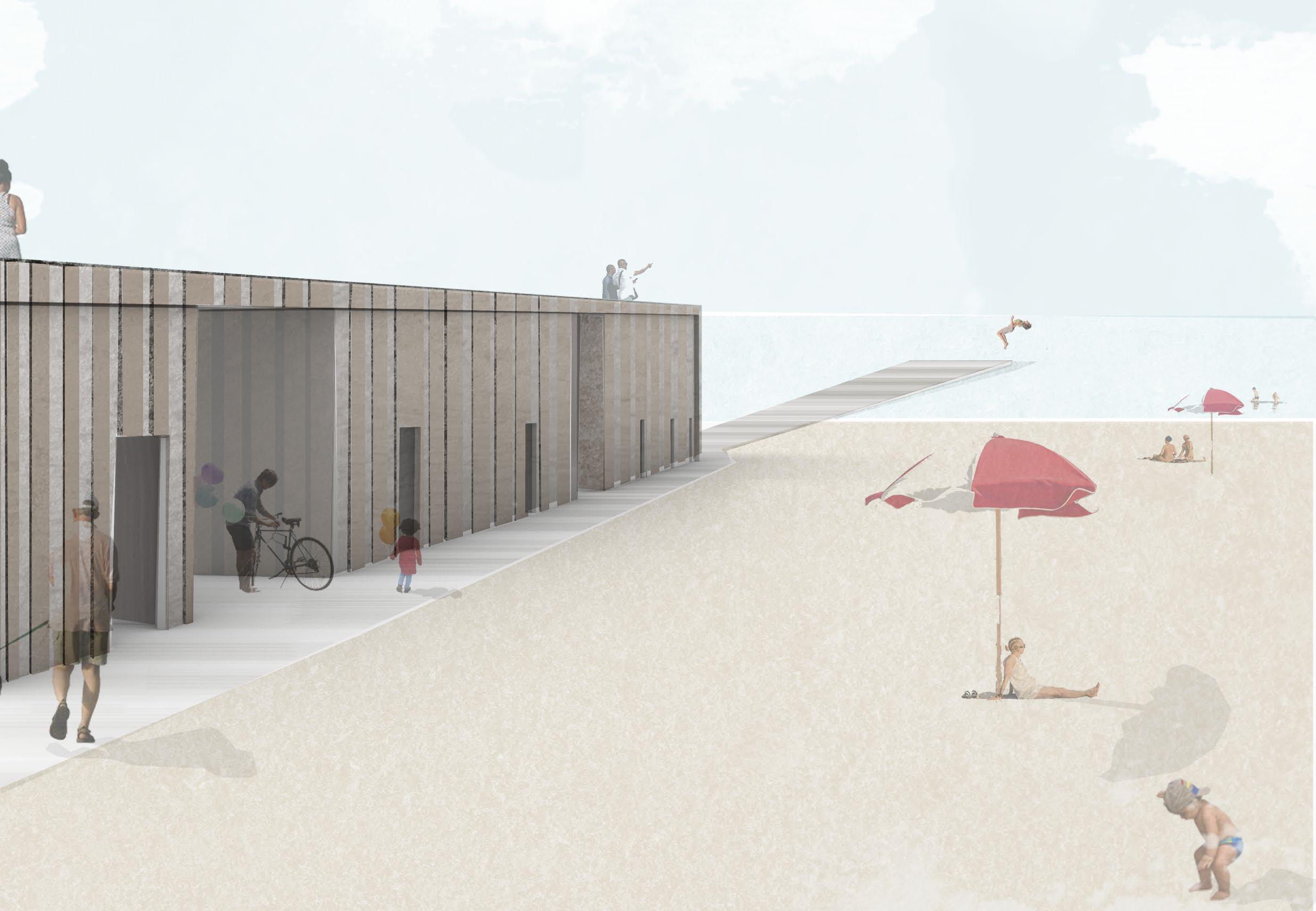 At the ground floor the structure is crossed by pedestrian and cycle paths that lead from the ur ban fabric to the dune. Above the dune the path becomes a suspended walkway, to minimize the impact on the natural environment. When it meets the shore, the path becomes a terrace overlooking the sea while underneath on the sand there are some bathing facilities. In the end the path be comes a pier, finally reaching the sea.