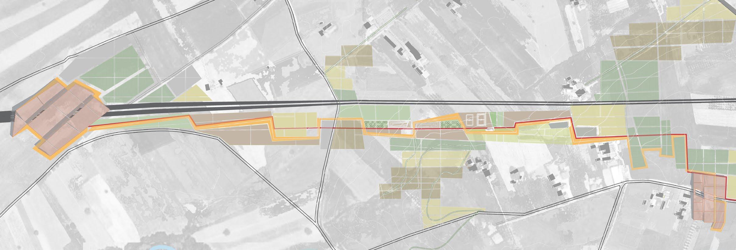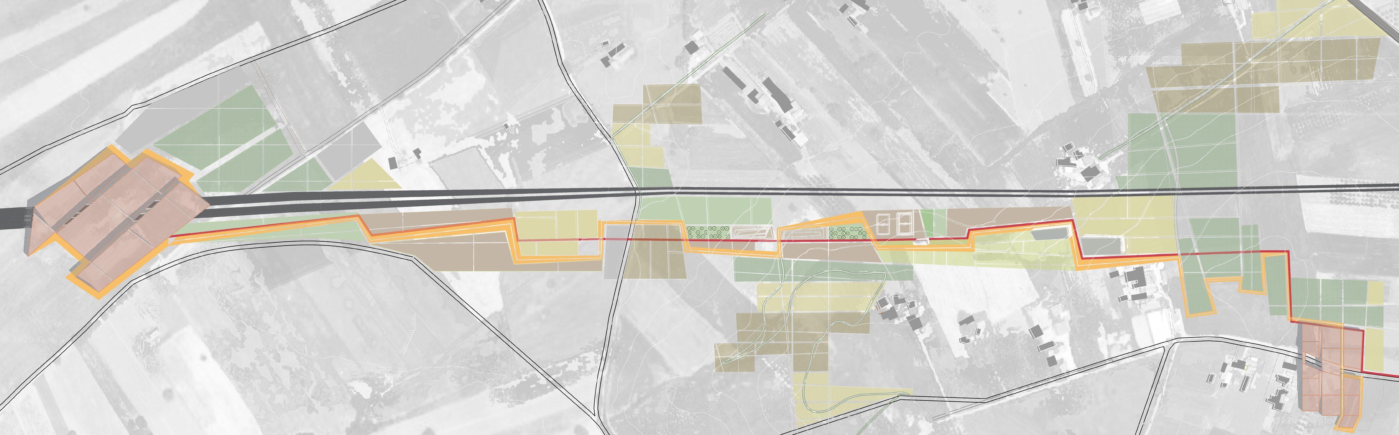 The idea is based on the connection between the new railway station, the future archaeological park and the neighboring vil lages(?) by means of a large linear park, which takes up the shape of the agricultural fabric, winding through the existing lots, and which would not only connect the two heads of the project but also enhances the agricultural vocation of the area. The railway station and the covering of the archaeological park take up the traces of the Irpinian pennata and the hill that led to define the common themes of the two projects: the thin laminar roof, the structure in piles, the relationship between full and empty and with the ground. My thesis work starts from the assumption that every territory can be saved and stems from the will to enhance my land. Irpinia has distinctive and unique landscape, historical and archaeological features that can be used as thestrategic tool for the realization of a node of territorial development.