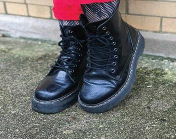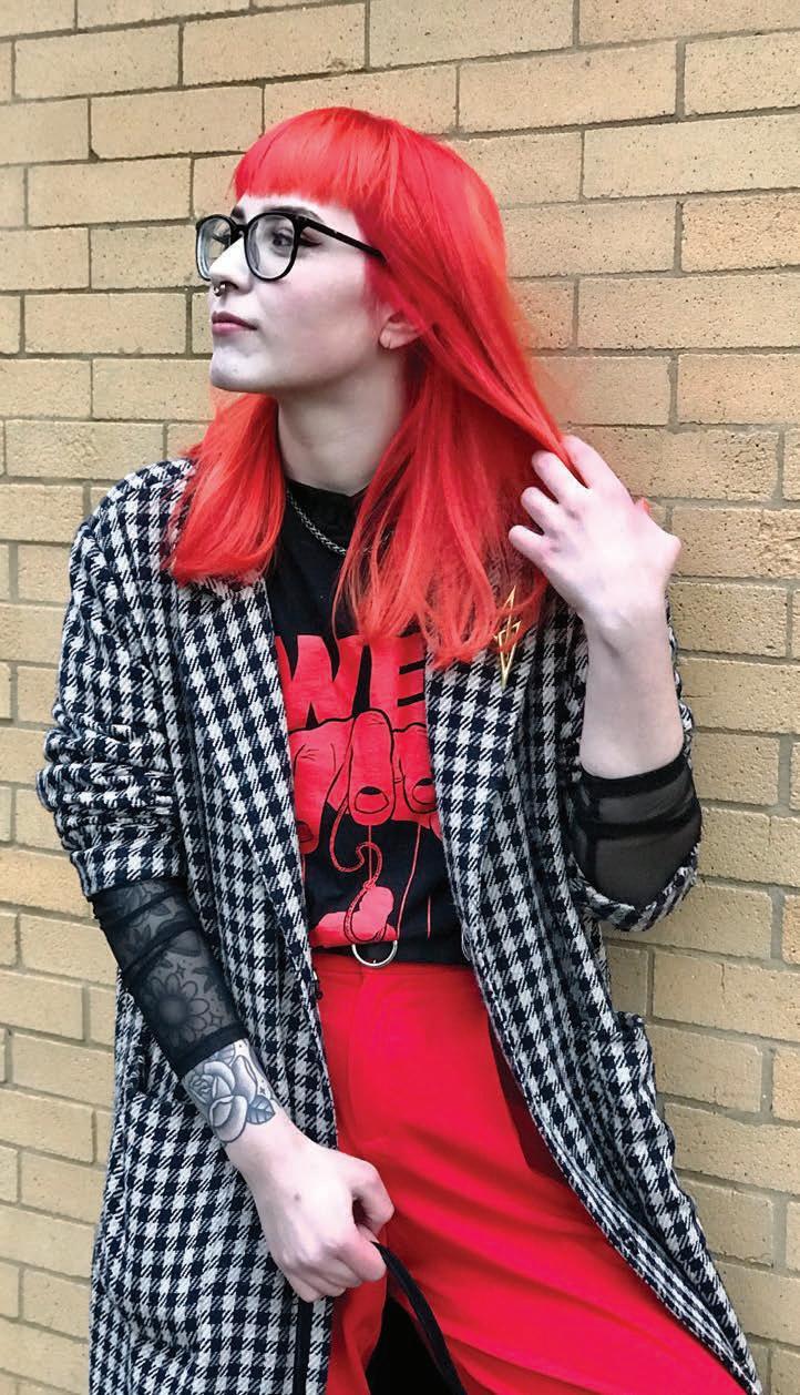 Working a traditional o ce job doesn’t deter Mandy Sears from making a bold fashion statement. Sporting an outfit she described as “punk rock meets business casual,” the 23-year-old appraisal coordinator managed to look both polished and rebellious by pairing classic pieces with edgier ones: a houndstooth duster coat with a black pair of Dr. Martens boots. Another way Sears stands out from the nine-to-five crowd is by not shying away from bright colors, which are amplified by her fiery red strands. “I like to match my hair color with a lot of my clothes,” she says. “I’m also partial to menswear. And I love layering! I’ll put fishnets under plain pants to make them more fun; instead of wearing just a T-shirt, I’ll put on sheer turtlenecks underneath.” Most of Sears’s elaborate wardrobe comes from thrift stores: “Many of my clothes come from the 60s. I’m really into 60s mod, but I mix it with modern pieces,” she says.