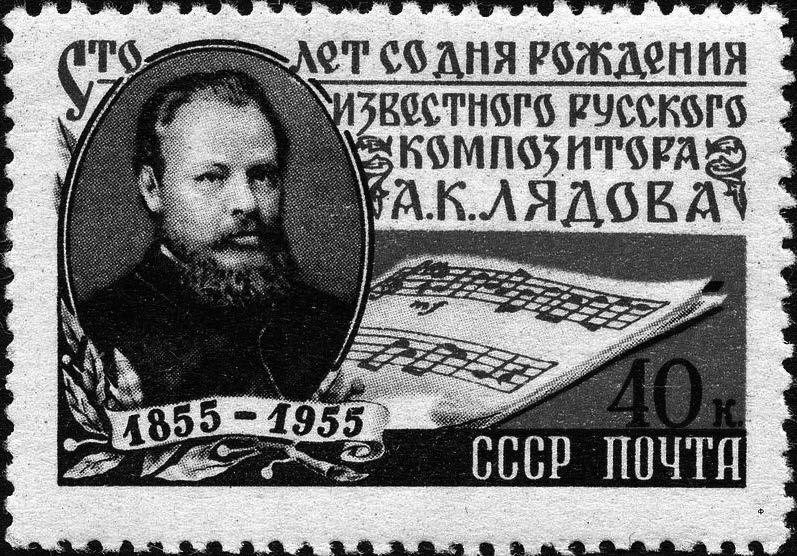 above: Postage stamp marking the hundredth anniversary of Liadov’s birth, issued in July 1955 and including a portrait of the composer and a fragment of his Eight Russian Folk Songs. Art by A. Zavyalov
