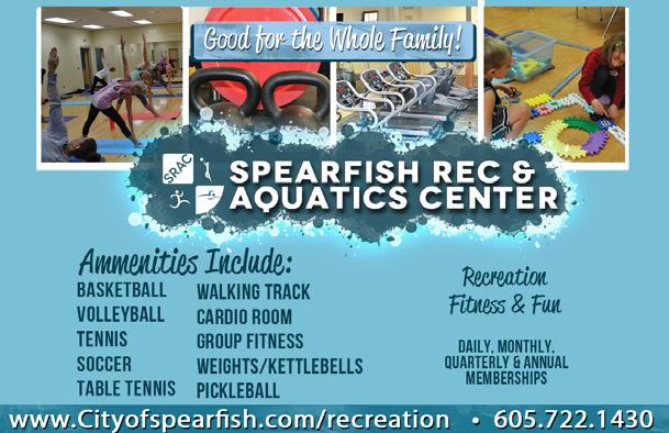 Spearfish has been called “naturally inviting” and that term can be attached to the area’s outlook on health and wellness. Indoor activities found throughout Spearfish enhance the body by aerobic exercise, body sculpting, and endurance. Those include weight-lifting, strengthbuilding, martial arts, swimming, track, tennis, soccer, basketball, yoga, pilates, dance, spinning, and more. Spearfish is a renowned mecca for a variety of outdoor activities, such as rock climbing, hiking, kayaking, tubing, skiing, mountain biking, swimming, and running.